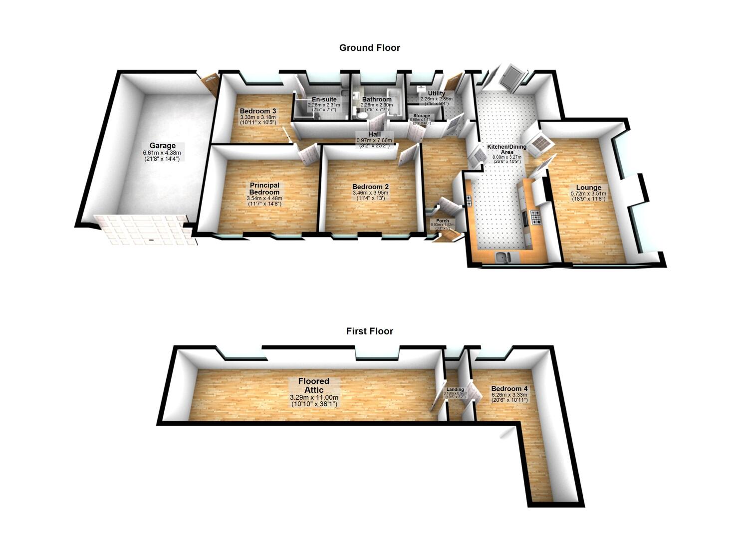 The accommodation comprises three well-proportioned downstairs bedrooms, one with a contemporary ensuite shower room. The ground floor also benefits from a family bathroom and a utility space. To the first floor a fourth bedroom and a spacious floored attic providing endless options for a future owner.