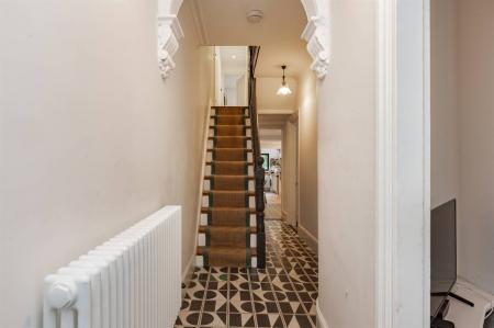 Partially glazed painted wood front entrance door. Radiator. Understairs storage cupboard. Stairs leading to first floor. Tiled flooring.