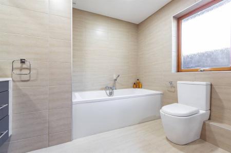 Suite in white comprising panelled bath with mixer tap and hand held shower attachment, large separate fully tiled walk-in shower cubicle with rainfall shower head and additional shower head, wall hung wash hand basin set into vanity unit with drawers below and close coupled WC. Underfloor heating. Chrome headed towel rail. Tiled walls. Frosted window to side. Tiled flooring. Extractor fan. Shaver point.