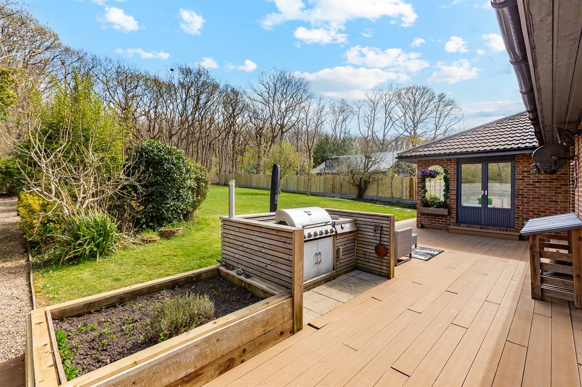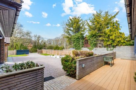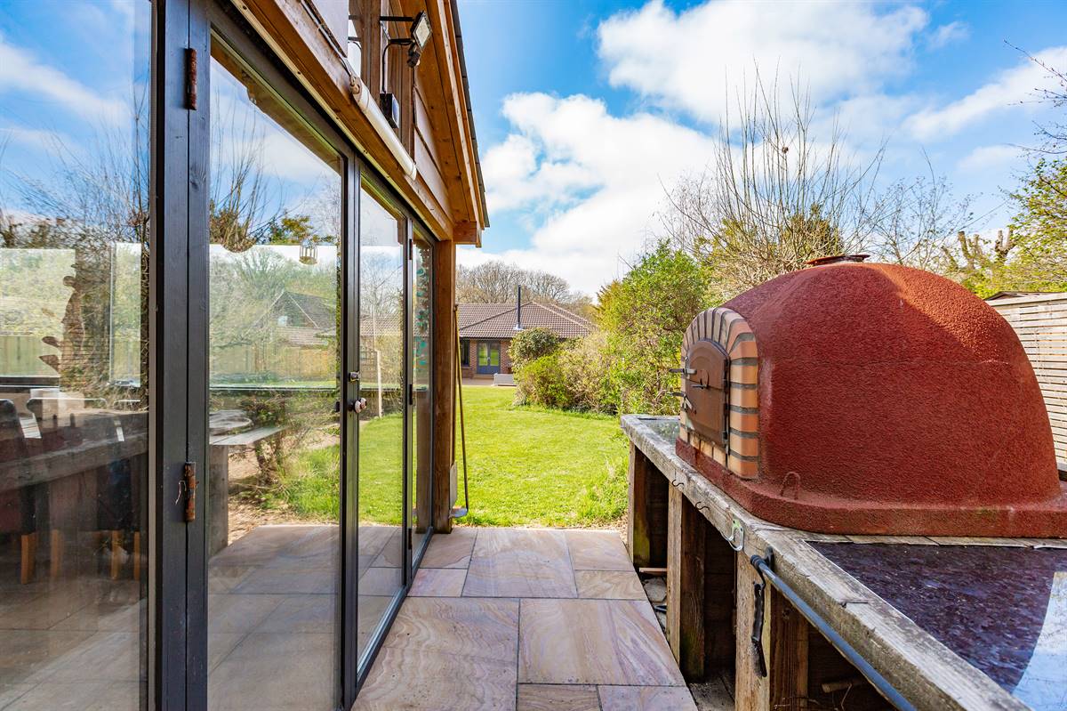 Mainly laid to lawn with flower beds, bushes and shrubs. Variety of fruit trees. Composite decked seating area. Outside tap. Outside lighting. External power points. Pedestrian side access. Enclosed with fencing. Equipped barbecue area. Variety of herbs. Pedestrian gate to woodland. Tool shed. Pizza oven and outdoor sink next to enclosed seating area.