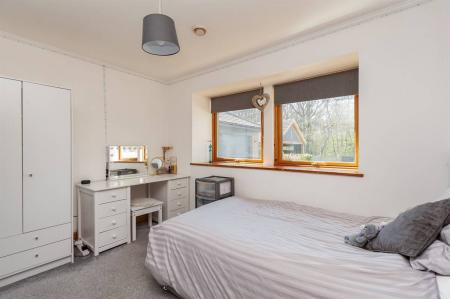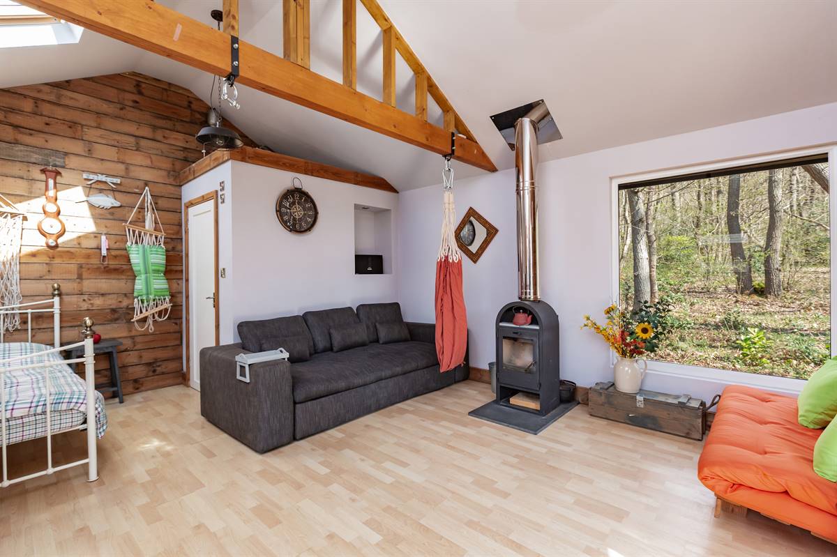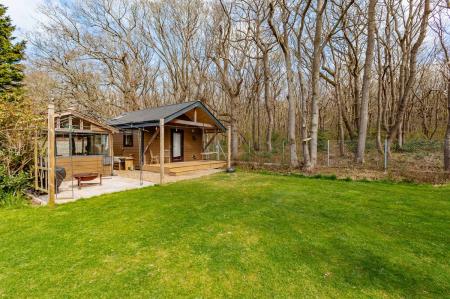Vaulted ceiling. Double glazed windows to front and rear overlooking woodland and garden. Log burning stove. Kitchenette area. Double door to veranda. Shower room with suite in white comprising shower cubicle, wash hand basin and close coupled WC. Extractor fan and towel rail.