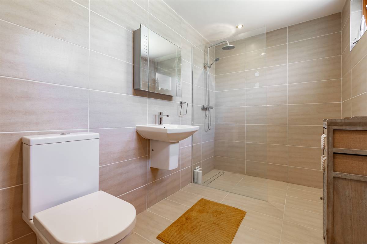 Suite in white comprising large tiled shower cubicle with fixed screen, rainfall shower head and additional shower head, wall hung wash hand basin and close coupled WC. Underfloor heating. Chrome heated towel rail. Tiled walls. Two frosted windows to side. Downlighters. Tiled floor. Extractor fan.