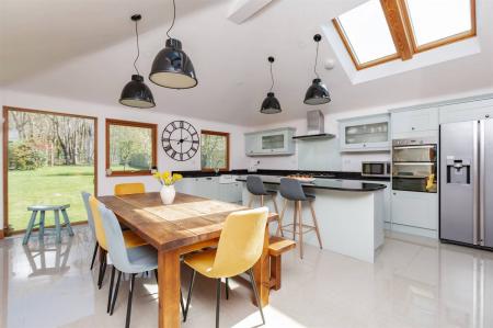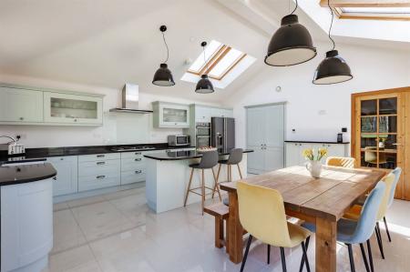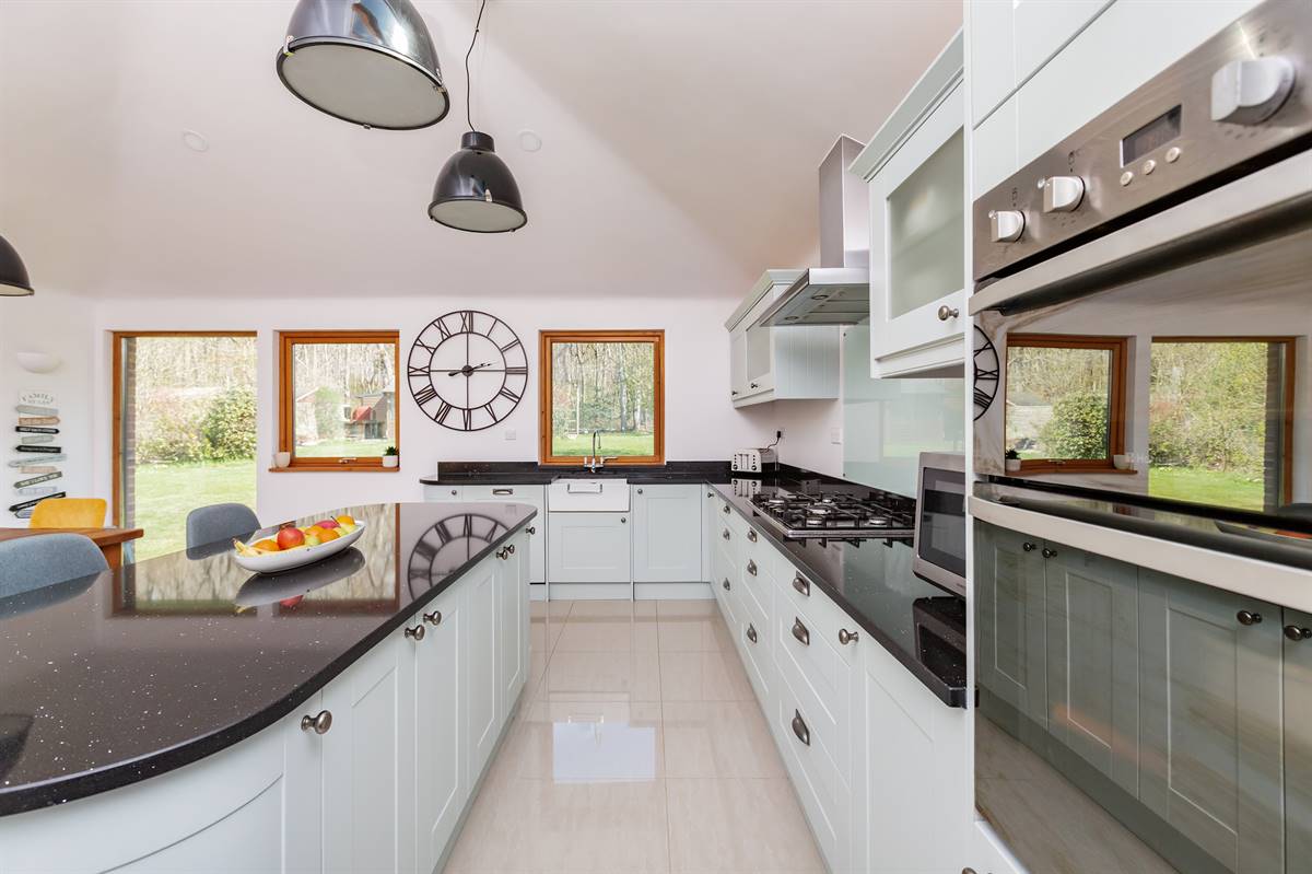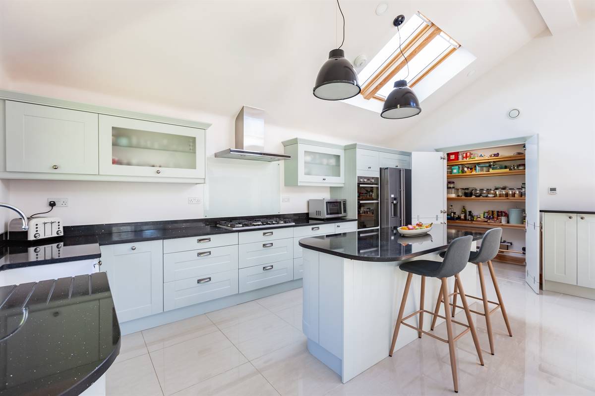 Matching range of wall and base units. Undermount ceramic sink unit with filter tap. Granite work surfaces with drainer grooves and upstands. Large Island unit. Inset fitted gas hob with stainless steel extractor cooker hood above. Built-in fan assisted electric double oven. Integrated dishwasher. Windows to rear overlooking garden. Underfloor heating. Vaulted ceiling with four Velux windows. Tiled floor. Double door providing access to rear garden. Large walk-in pantry with light.