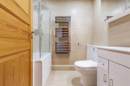 Suite in white comprising panelled bath with mixer tap, separate shower unit over bath with screen to side, wash hand basin set into vanity unit with cupboard and drawers below and WC with concealed cistern. Underfloor heating. Chrome heated towel rail. Partially tiled walls. Tiled floor. Extractor fan.