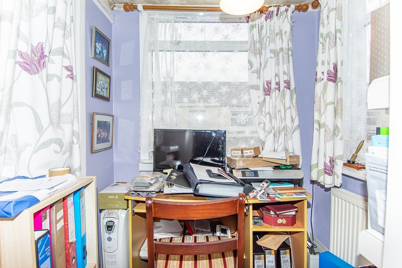 Currently used as an office this room has dual aspect windows and a central heating radiator. There are power points and oak laminate flooring as well as wall mounted shelves. A UPVC door gives access to the front garden.