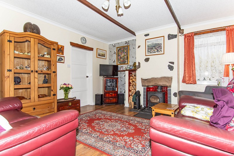 This lovely room has a feature papered wall and oak laminate flooring. There are exposed ceiling beams and coving. The multi-fuel stove creates a focal point within the lounge which also benefits from a central heating radiator, a ceiling rose and a triple light fitting. There is a useful wood store to the side of the fireplace as well as wall mounted shelving. This is a bright room that also benefits from dual aspect windows.