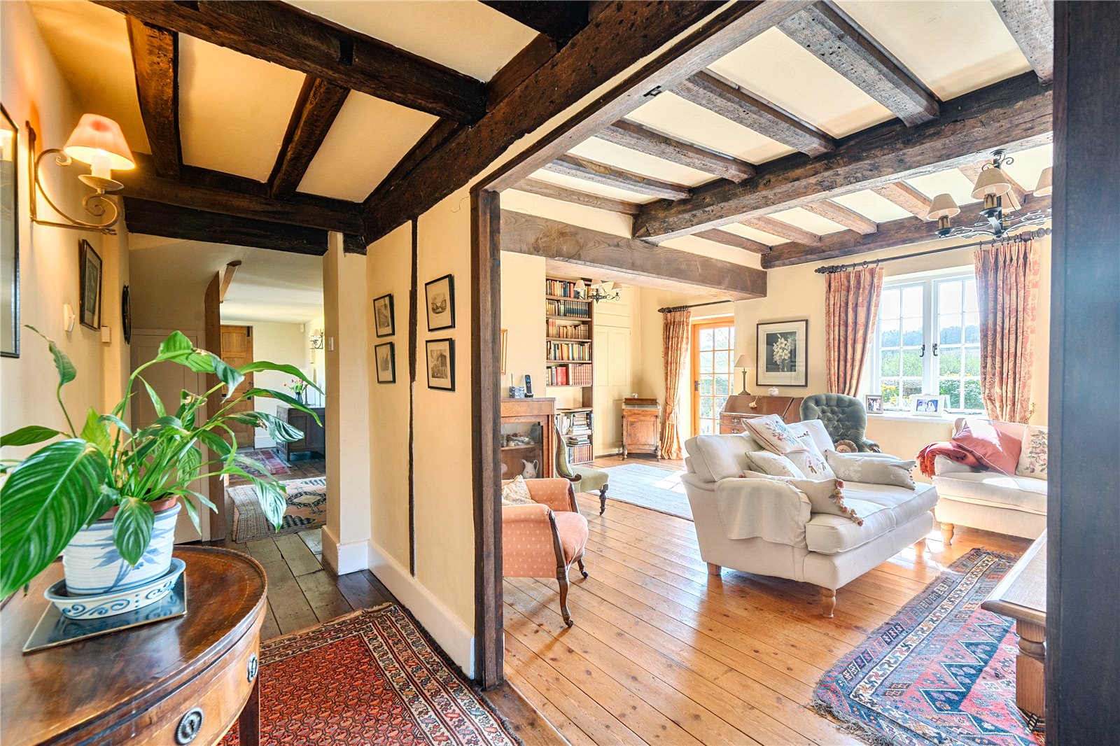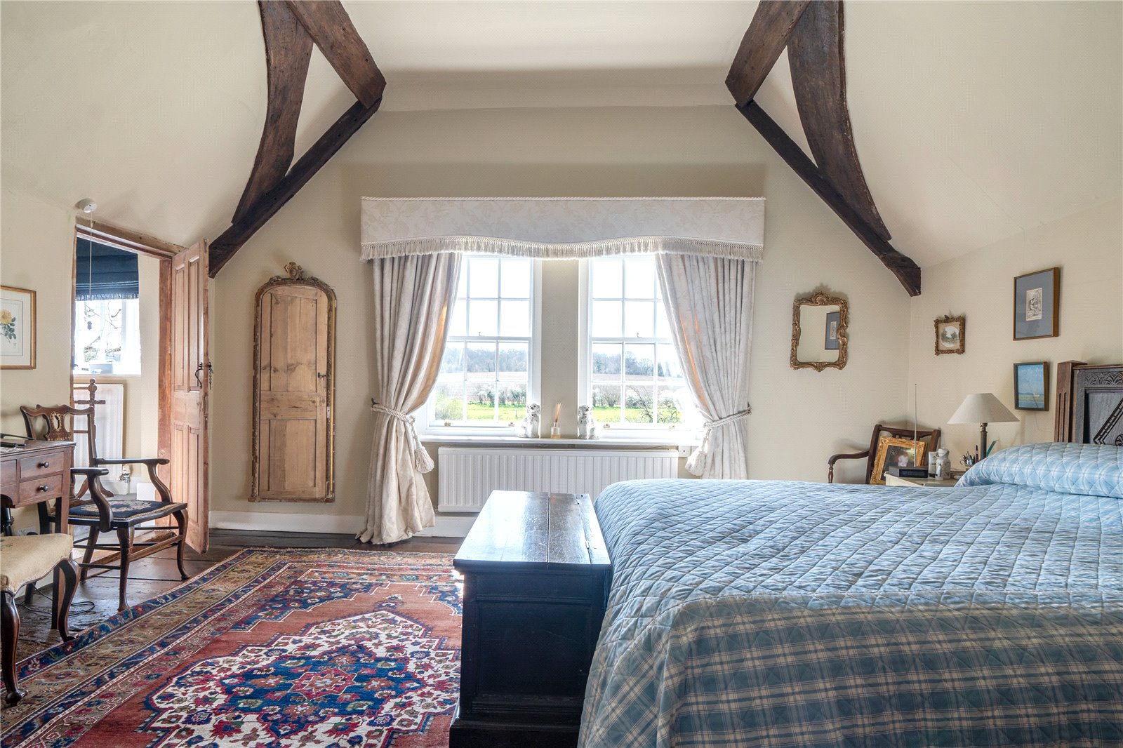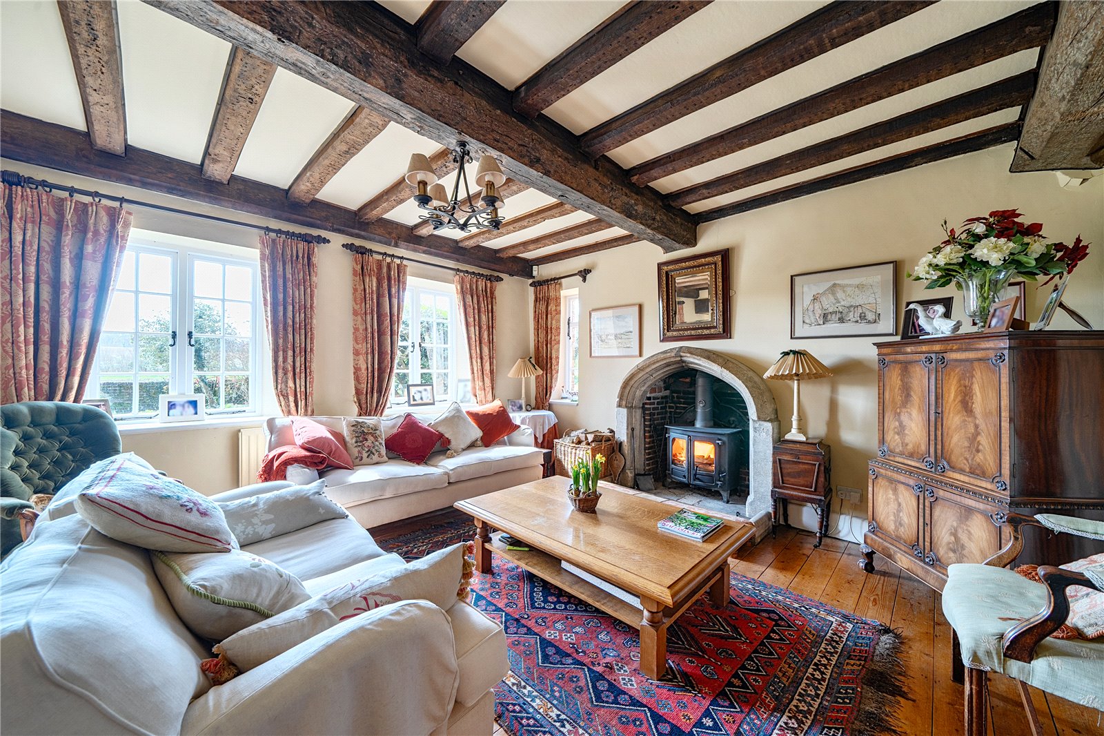 Sitting Room Front aspect with views towards neighbouring farmland. Door to front garden. Magnificent ceiling beams and exposed floorboards. Stone fire surround housing a wood burning stove.
