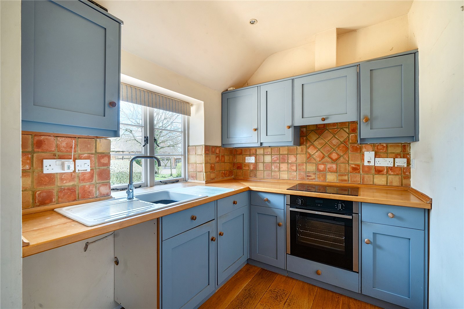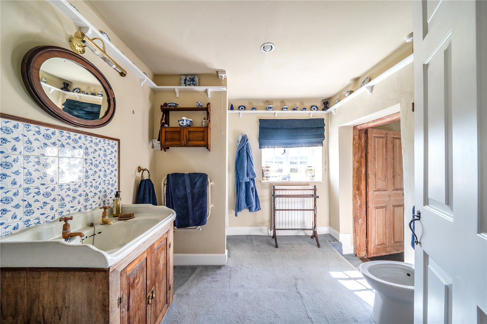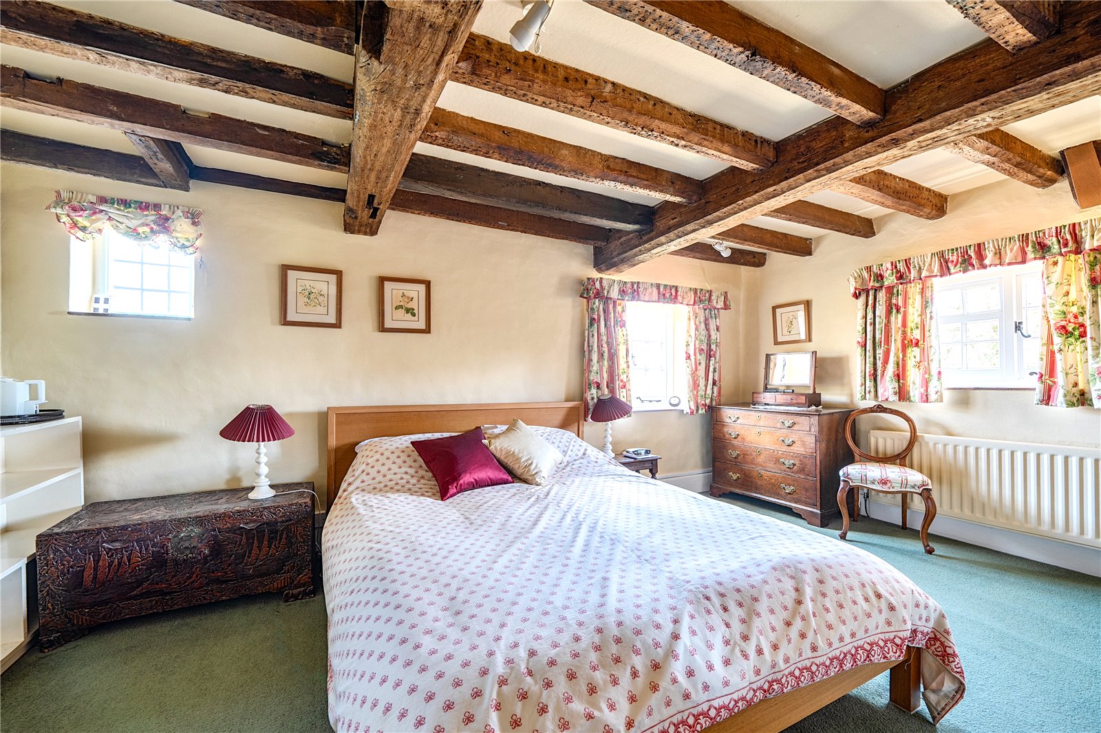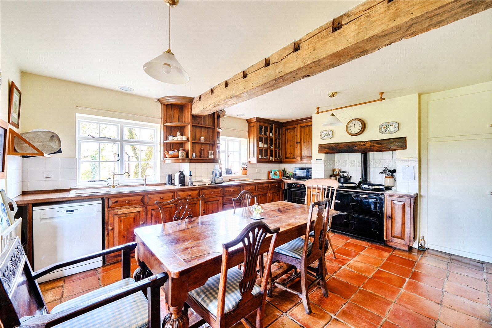 Sitting Room Front aspect with views towards neighbouring farmland. Door to front garden. Magnificent ceiling beams and exposed floorboards. Stone fire surround housing a wood burning stove.