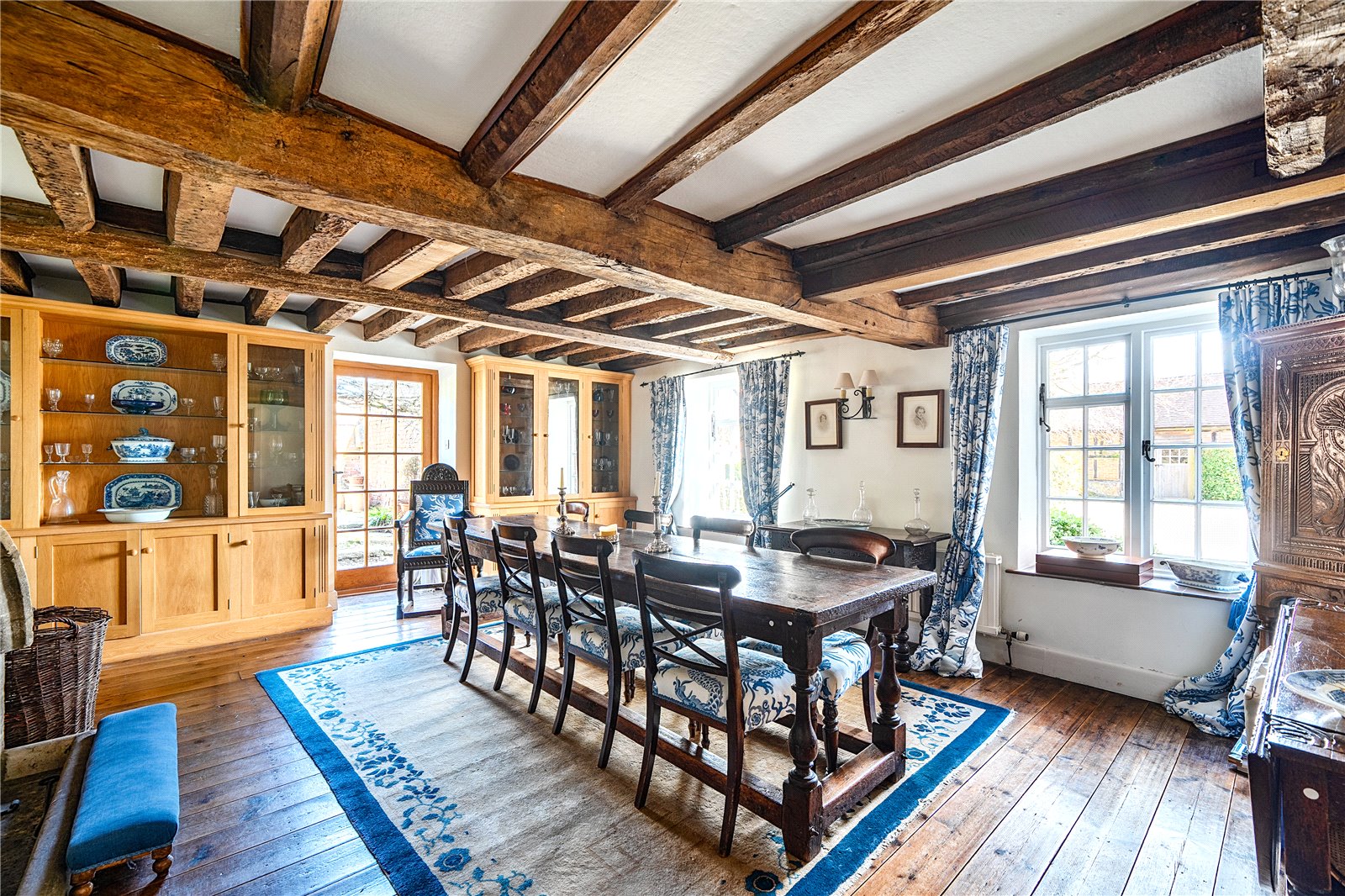 Dining Room Dual aspect with door to rear courtyard. Exposed ceiling beams and floorboards. Stone fire surround.