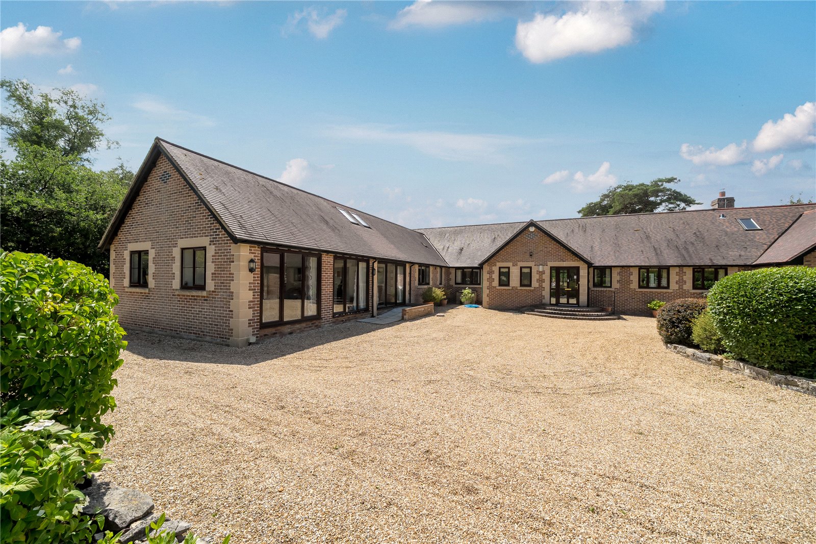 The property is approached via a set of electric gates, with an entry phone. A long gravel driveway, with parking for several vehicles, leads up to front entrance and rear of property.
