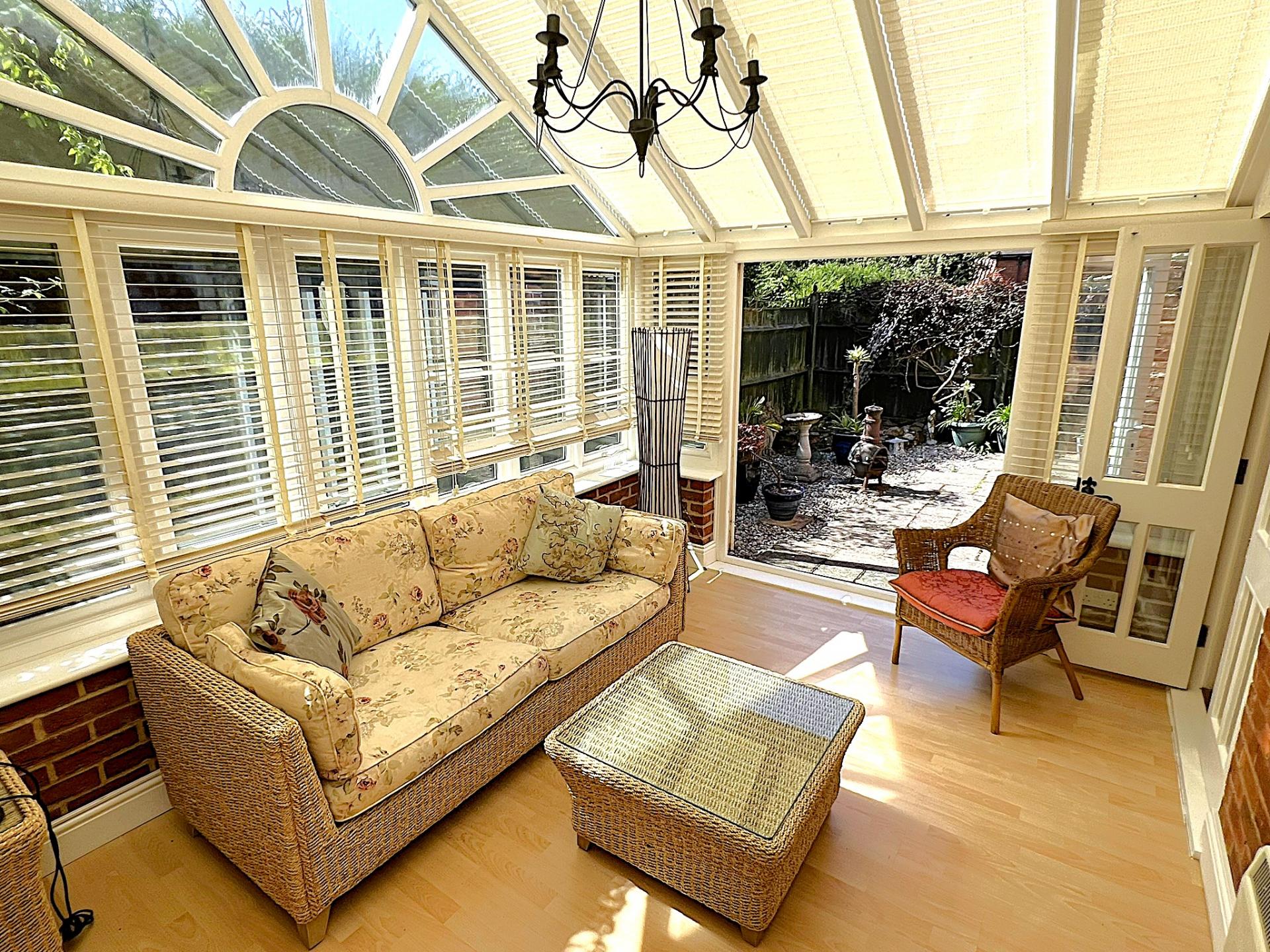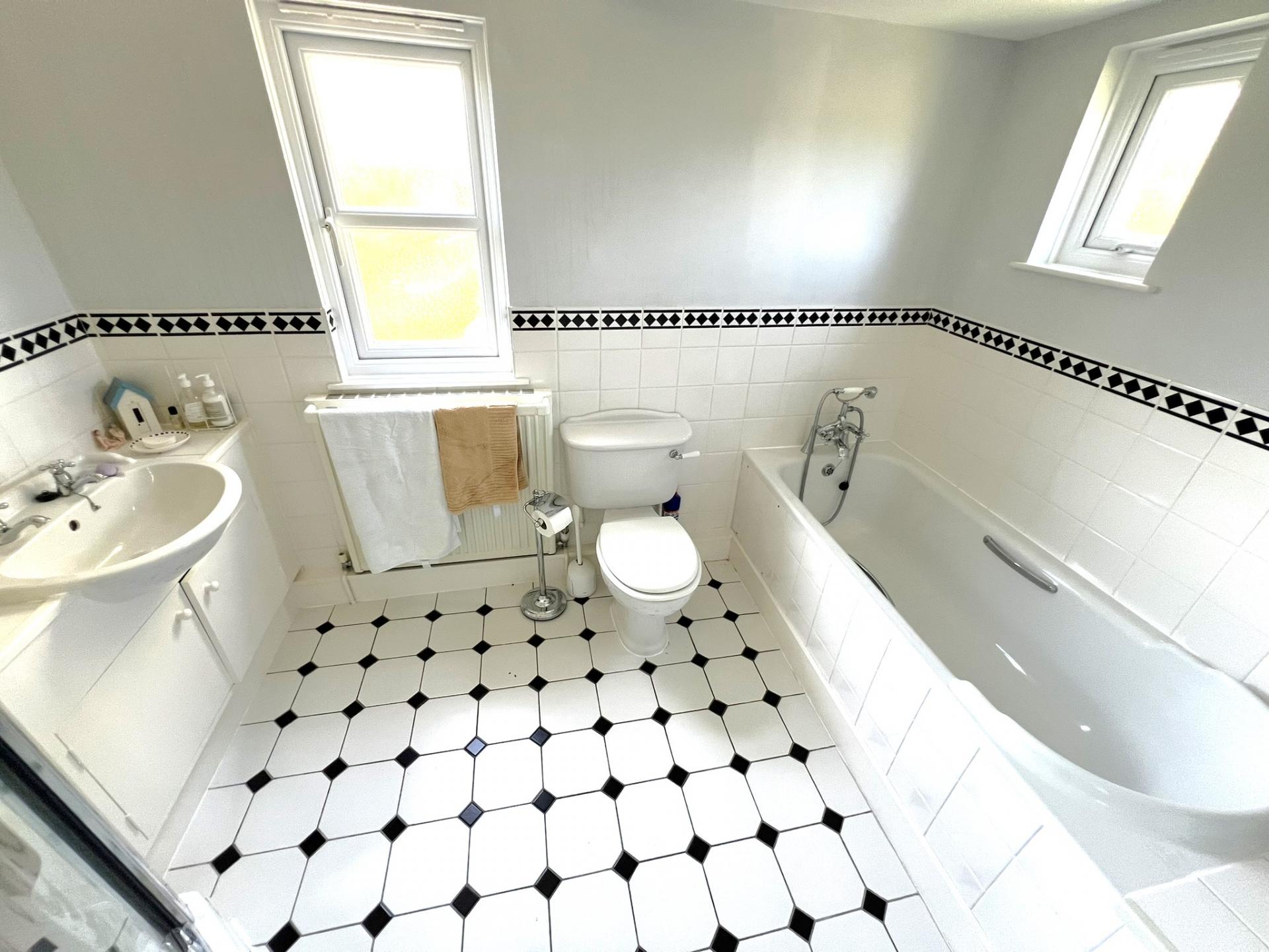 A set of French doors lead from the dining room out into a south facing conservatory with French doors opening out to the garden and a single glazed side door on the opposite side. A further door leads from the dining room into a small hall / stairwell that leads through to a generous living room with double aspect windows and central feature gas fireplace. The stairs lead up to a first floor landing off which is the principal bedroom with double aspect windows, built in wardrobe, and ensuite shower room with walk in shower, bidet, close coupled WC and washbasin with vanity unit below. Opposite the principal bedroom is a second generous double bedroom with corner mantel piece, south facing window and built in wardrobe. A landing passage leads from the top of the stairs to a third smaller double bedroom, and the family bathroom with panel bath, walk in shower, close coupled WC and washbasin with vanity unit below.