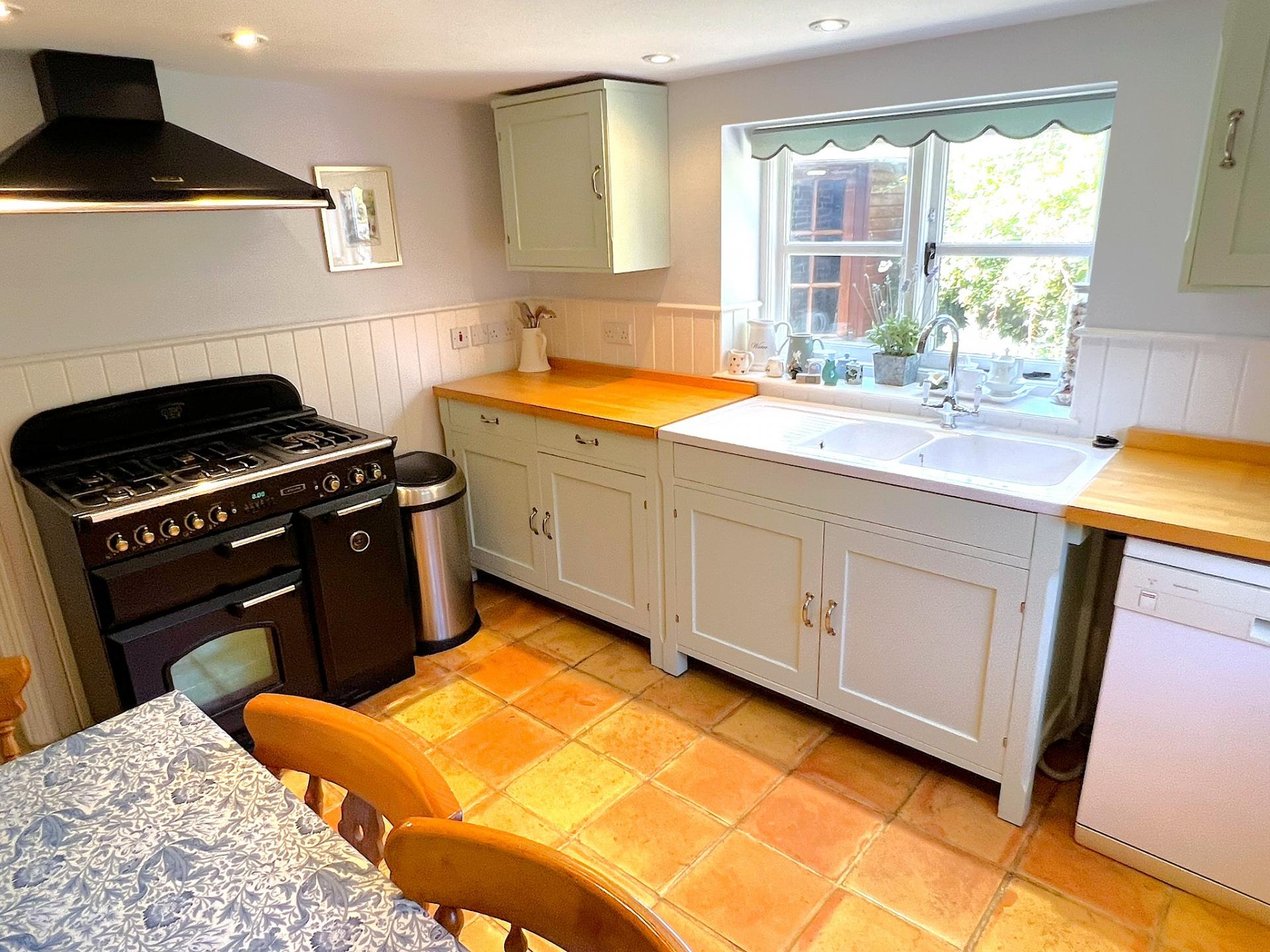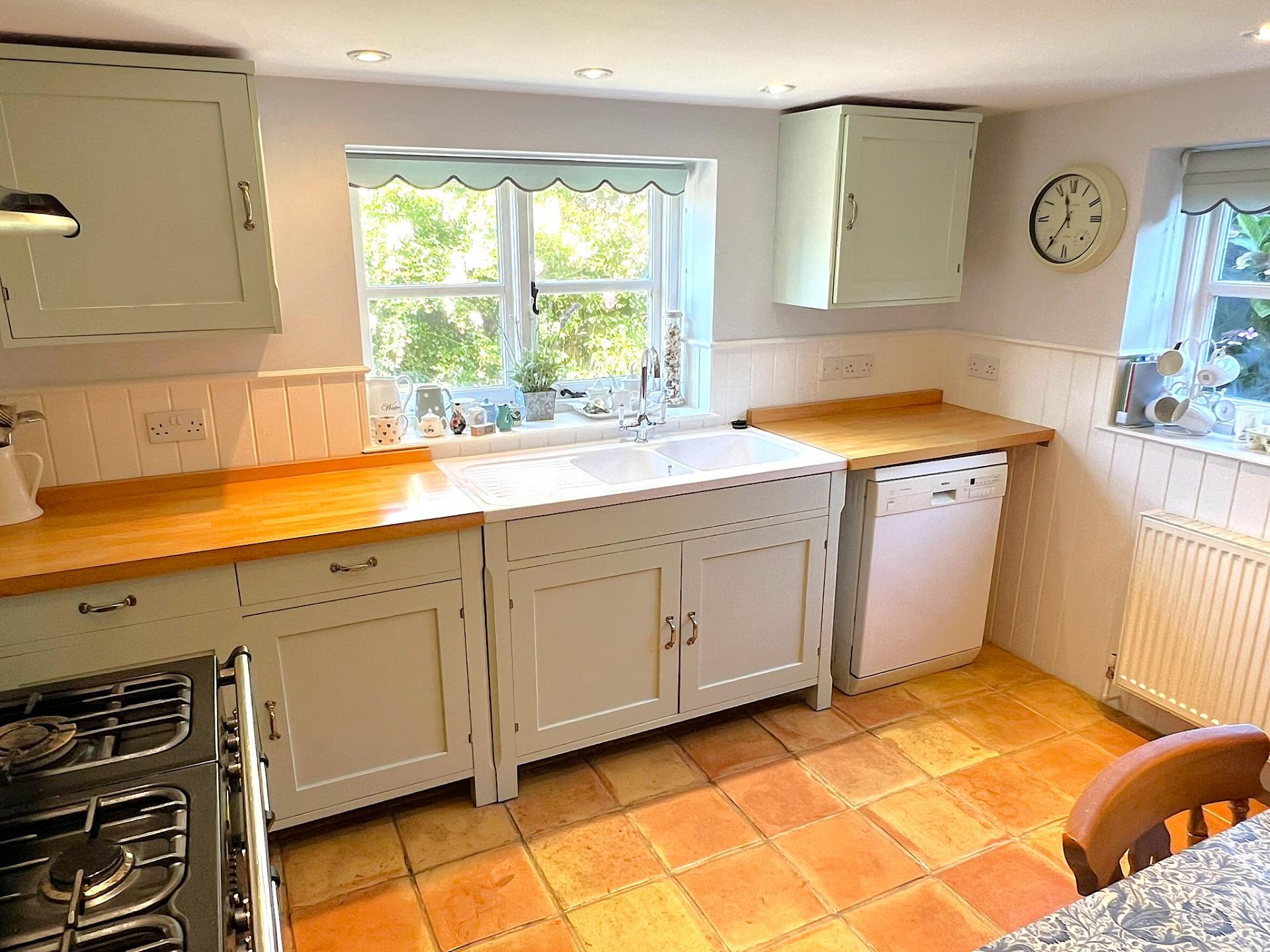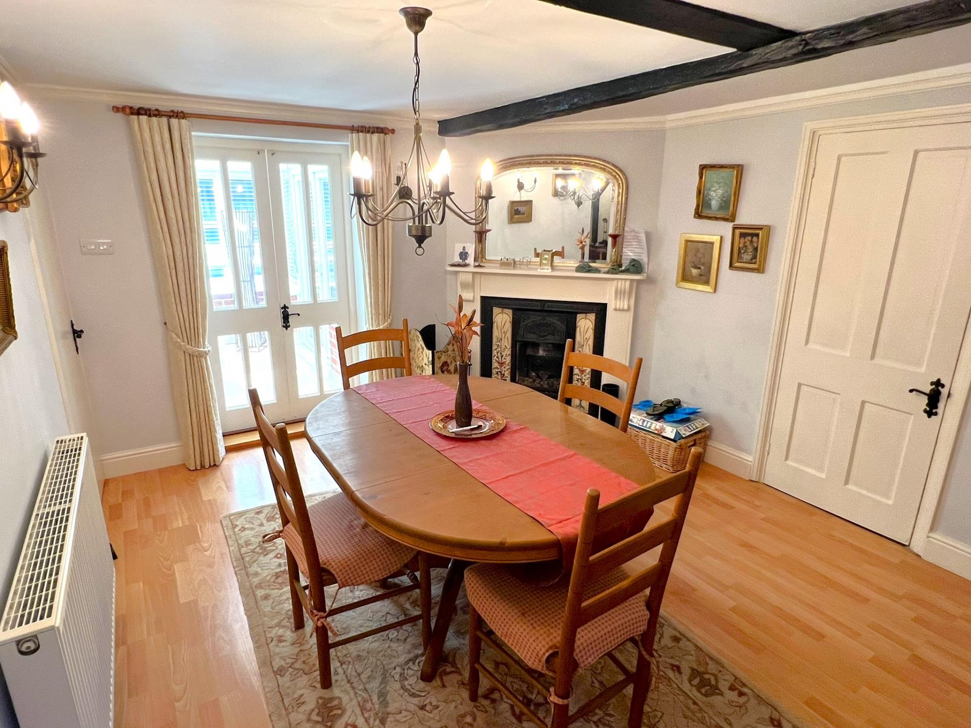 A central side door opens into a glazed entrance hall off which is a ground floor cloakroom/WC and opposite a coat cupboard. A central door opens into the dining room with corner fireplace (with condemned gas fire), under stairs cupboard, exposed timbers, and access door through to the kitchen. The kitchen /breakfast room benefits from double aspect windows and is fitted with hand painted shaker style units with wood worktops, ceramic sink and drainer, space and plumbing for a dishwasher, and large gas range cooker. A connecting door leads from the kitchen into a utility room with further shaker style units with wood worktops, double sink and plumbing for a washing machine, and a rear access door that leads out to the garden.