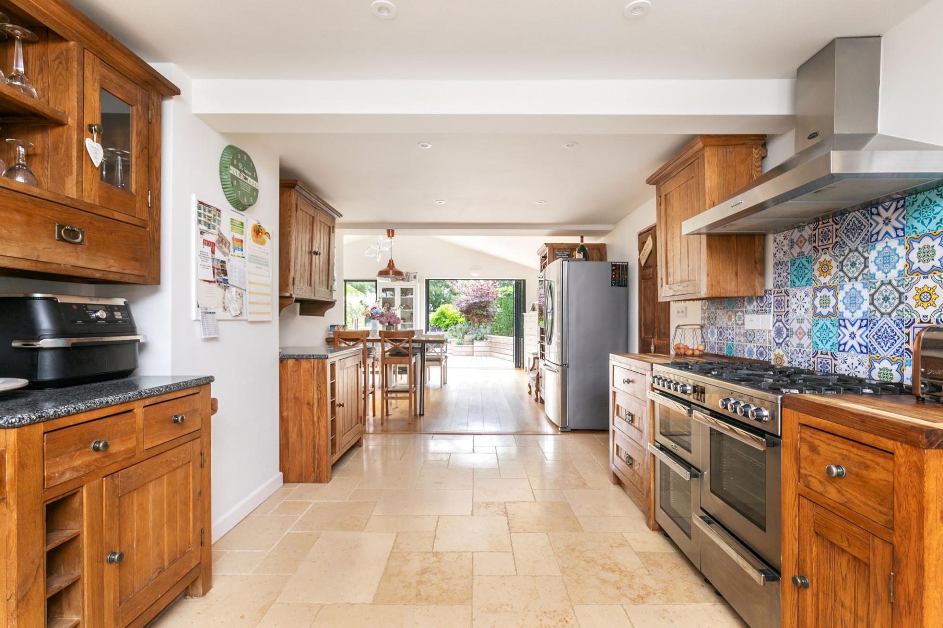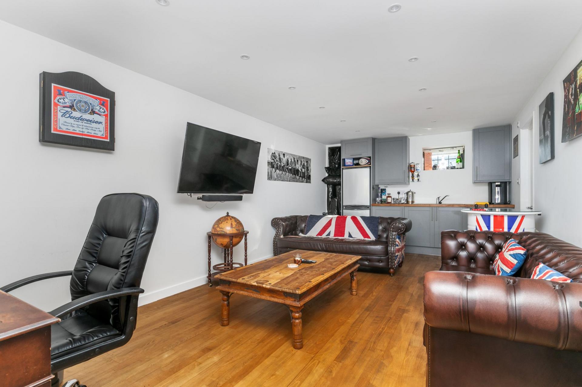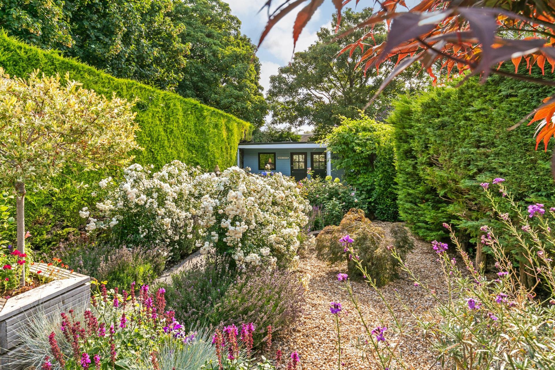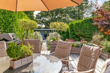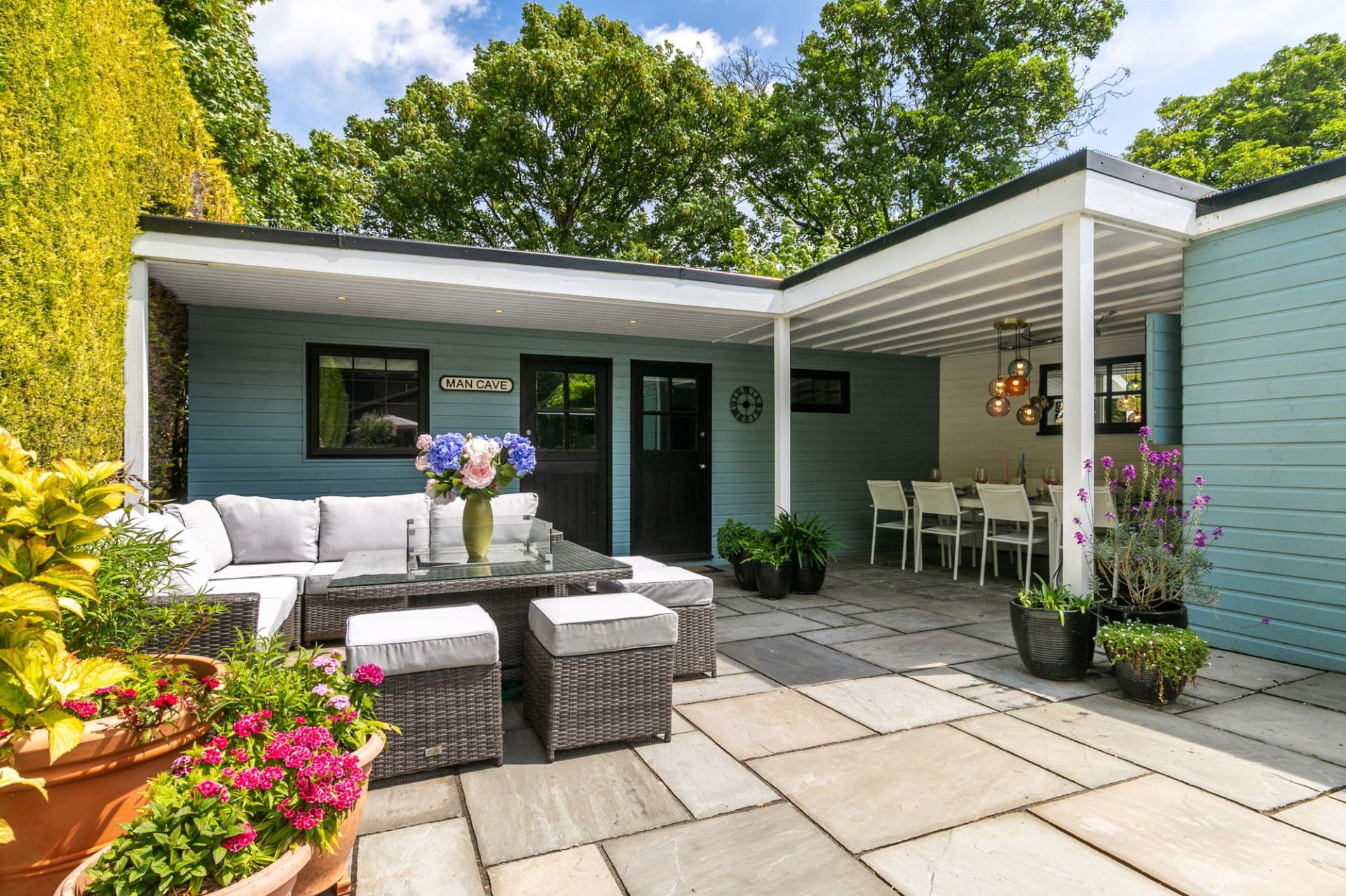 Outside, the private and unoverlooked garden is a true highlight. Framed by mature hedging, stunning roses and lavender and thoughtful planting, it features three distinct seating and dining areas, making it the perfect space to relax, play, or entertain. A modern outbuilding houses a home office/family room, home gym, shower room, and a covered entertaining area with a bar, ideal for summer parties or teenage hangouts. A large storage shed and bike store add practical touches, and a generous driveway provides ample off-street parking.