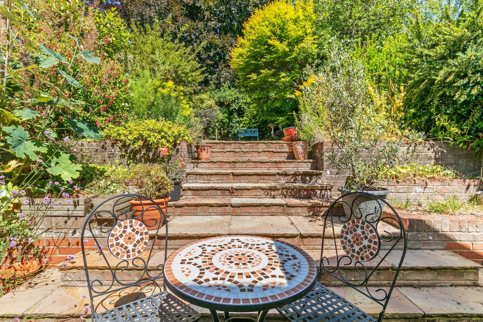 Outside, the garden is a well-proportioned space with a terrace directly behind and centralised steps flanked by raised planters. The next section of the garden is laid to lawn with shrub borders, leading to a further area which has a shaped gravel path with raised beds, and a garden shed and home office, both connected to mains electricity and approximately 138 sq. ft in total. A gate at the top of the garden leads into the grounds of Peter Symonds College.