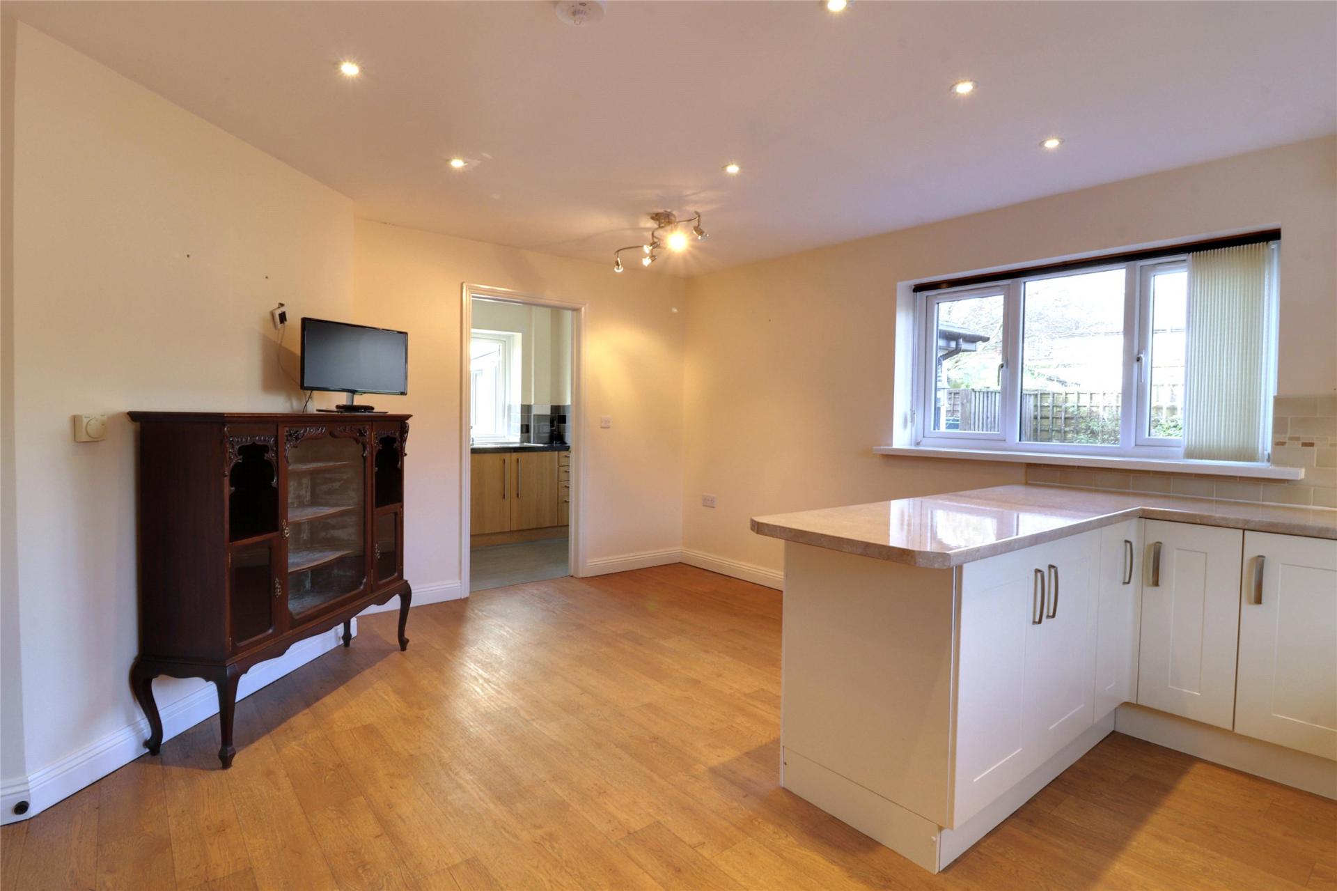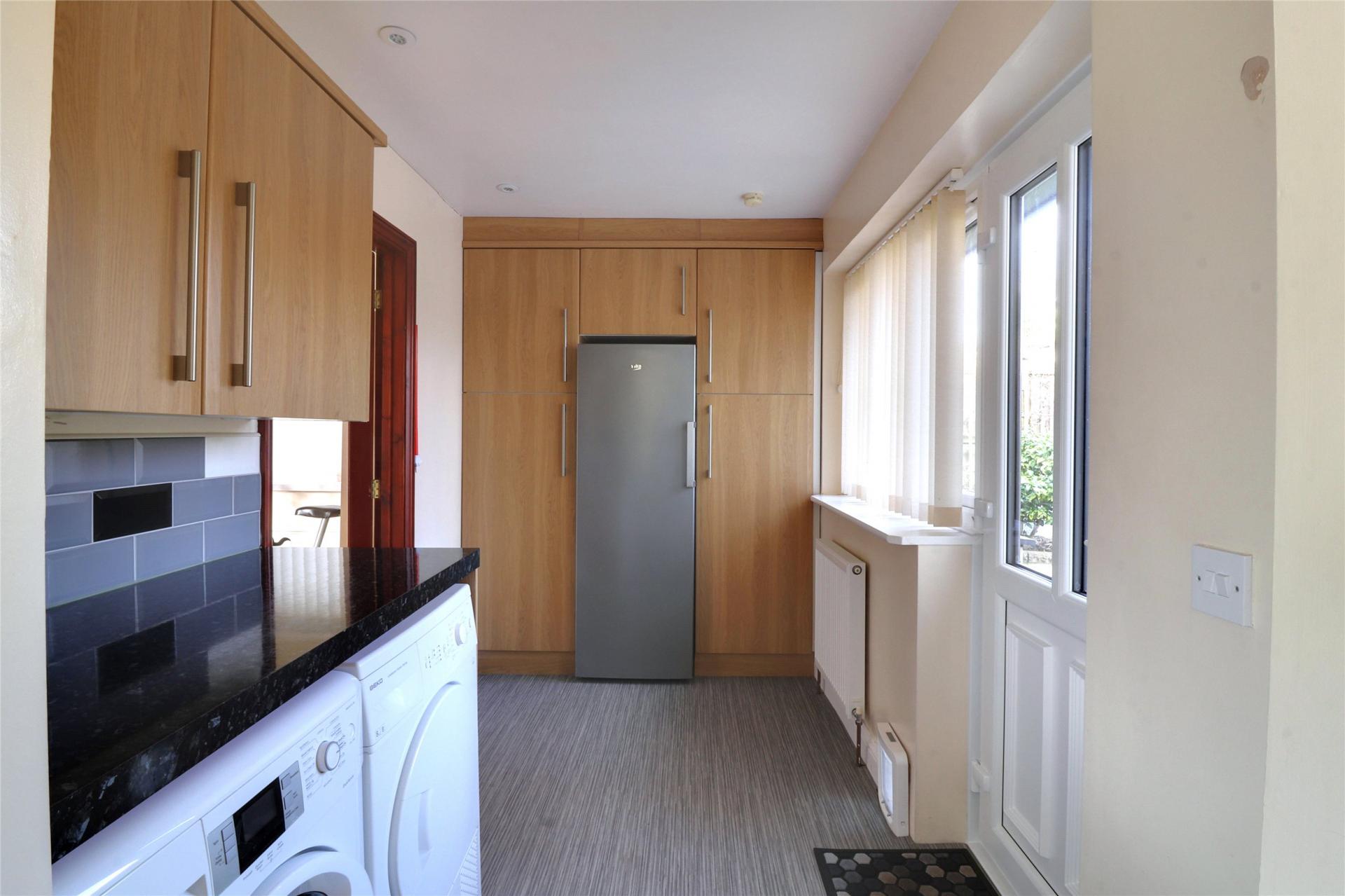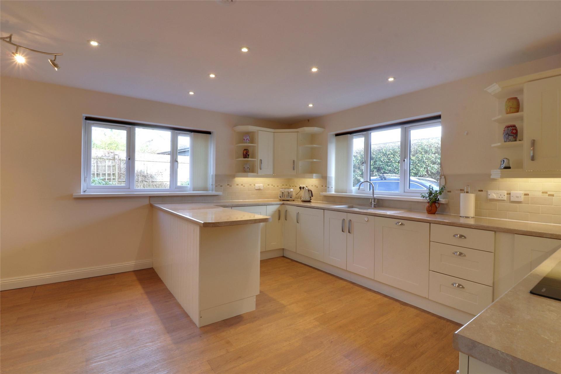 The bungalow is entered via a light and welcoming entrance hall, which provides access to the main living areas. The kitchen/dining room sits at the heart of the home and has been thoughtfully designed, featuring a range of matching wall and base units, inset sink, fitted oven and hob, as well as an integrated under-counter dishwasher and fridge. There is ample space for a dining table, making it an ideal setting for family meals and entertaining.