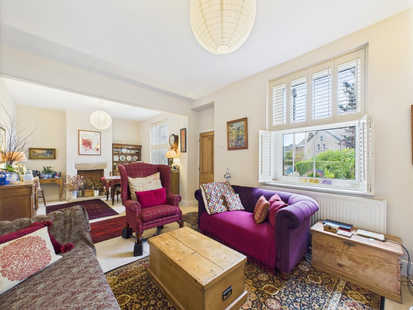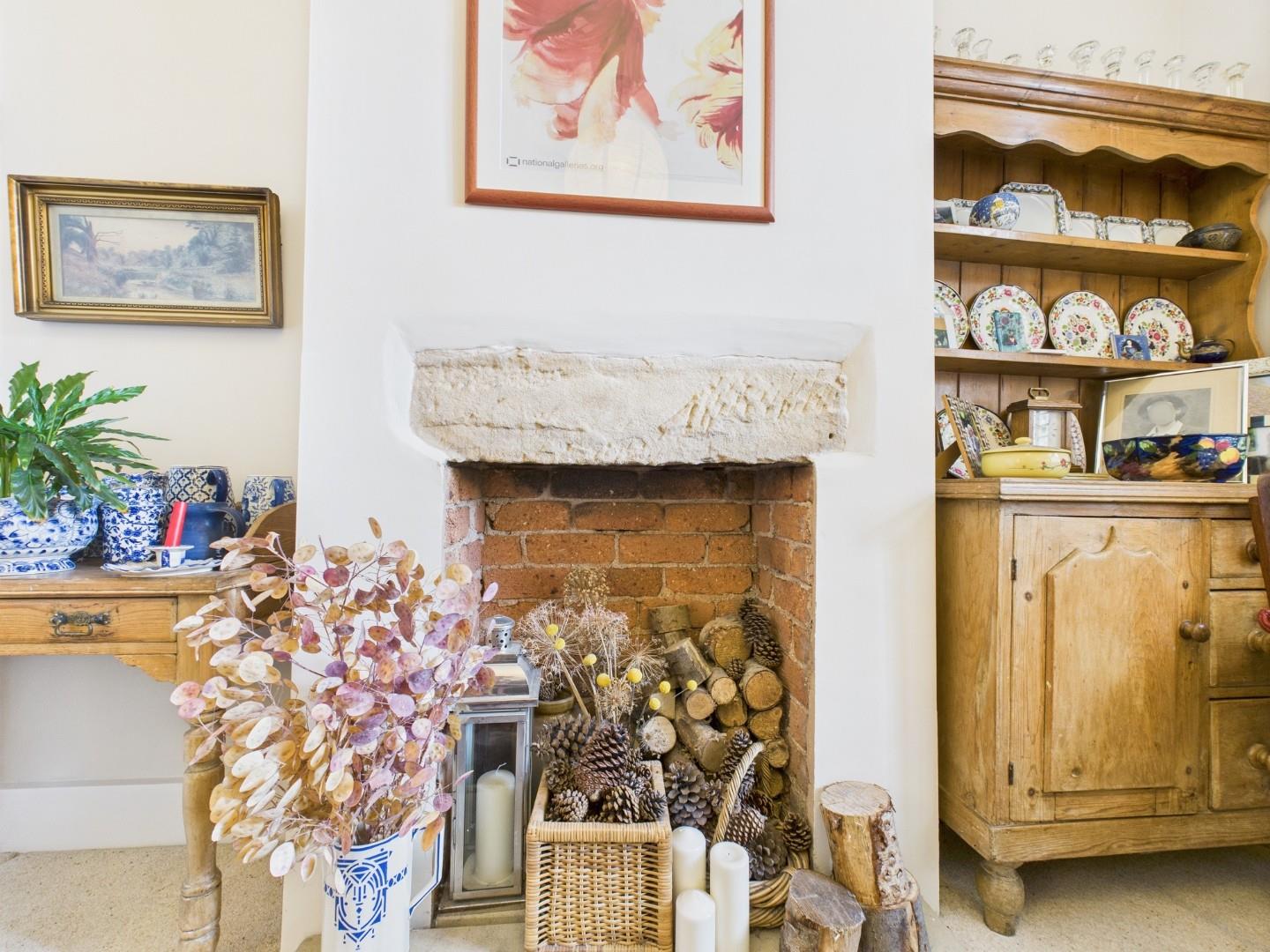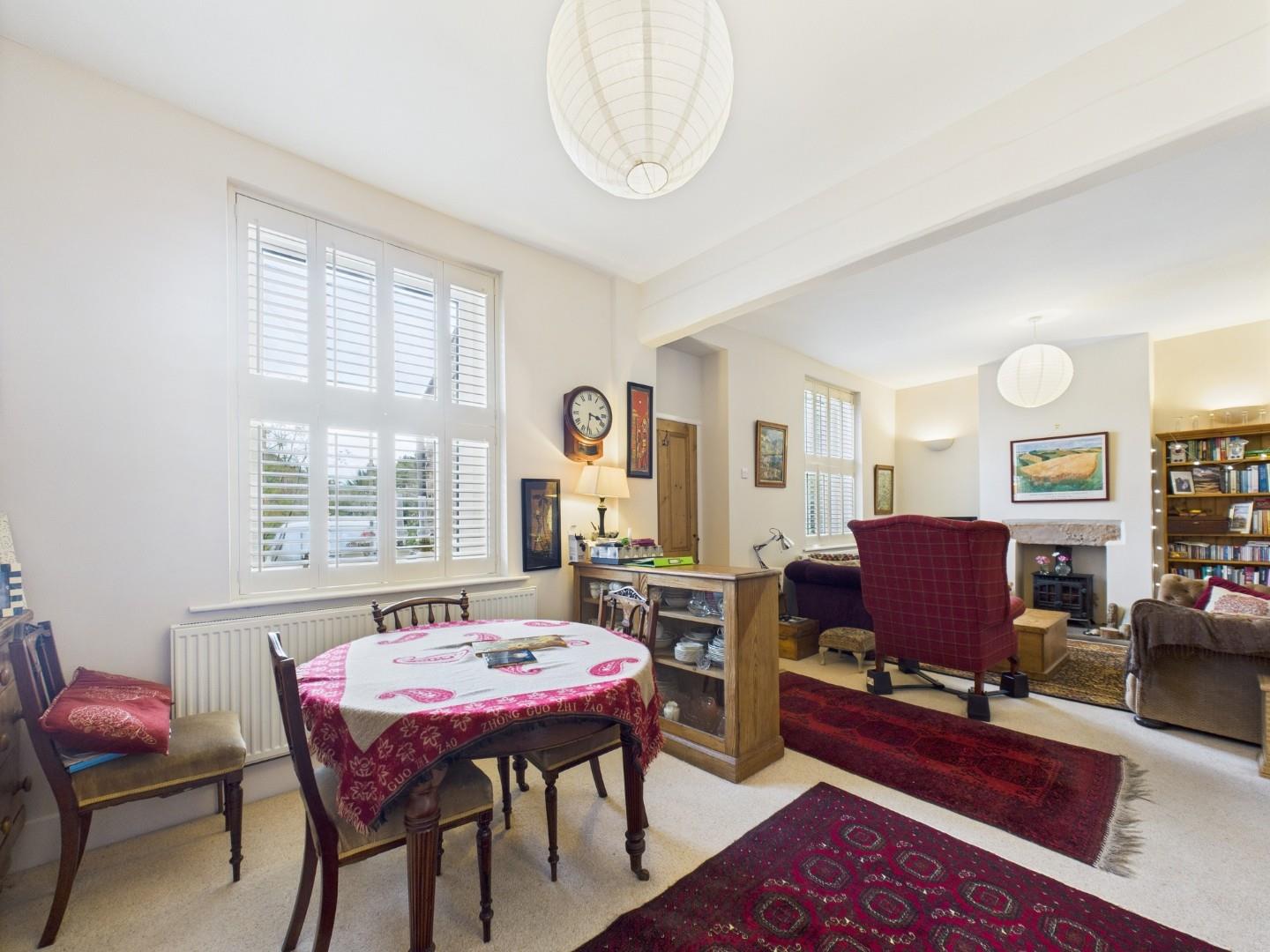Living / Dining Room - 7.90 x 3.45 (25'11" x 11'3") - This fantastic room is full of character and charm, anchored by original inglenook fireplaces at either end, in the sitting room area there is a handsome log burning stove. Two generous front-facing tip and tilt windows flood the space with natural light, complemented by bespoke wooden shutters for a contemporary edge. It's a versatile space, perfect for dining, entertaining, or simply relaxing. The original wooden door leads into the