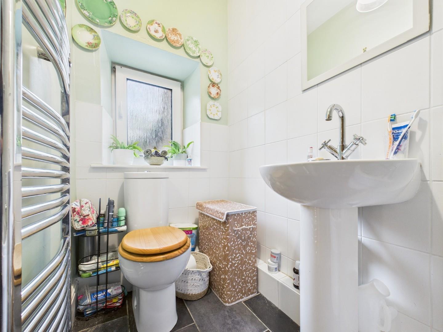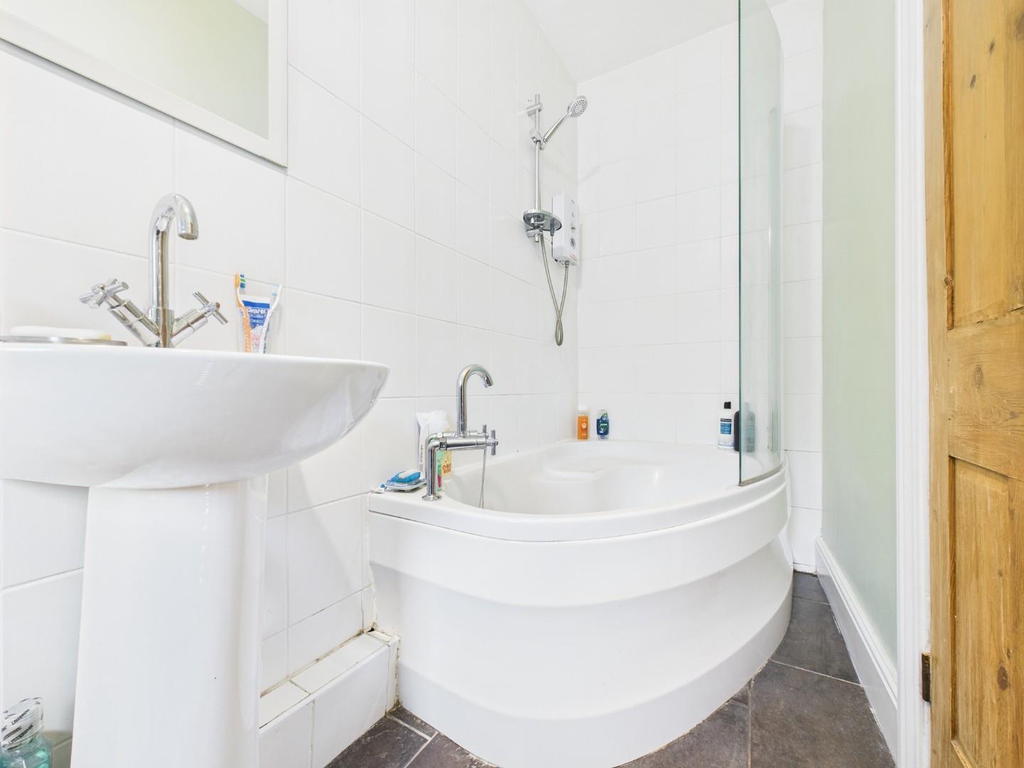Bathroom - 3.03 x 1.19 (9'11" x 3'10") - This well-appointed bathroom features slate-effect tiled flooring and is mostly tiled throughout, offering a low-maintenance finish. A rear-facing uPVC double glazed window with obscured glass provides natural light while maintaining privacy. The space is fitted with a modern three-piece suite, including a pedestal wash hand basin, panelled corner bathtub with electric shower overhead, dual flush WC, and a contemporary chrome ladder-style radiator.