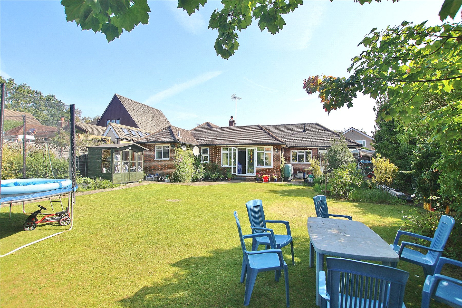 A rarely available detached bungalow, offered to the market with no onward chain, enjoying a superb position close to common land and within walking distance of Knaphill village, which offers an extensive range of amenities.The property is well presented throughout and provides generous accommodation, including three well-proportioned bedrooms. The master bedroom benefits from a luxurious four-piece ensuite bathroom, complete with a separate bath and walk-in shower cubicle.Further accommodation includes an open-plan dining room and a rear-aspect living room that enjoys wonderful views over the garden. The kitchen is fitted with a range of base and eye-level units, an integrated double oven with electric hob, and space for appliances, while an adjoining utility area adds practicality.A three-piece family bathroom completes the accommodation, featuring a WC, wash hand basin, and bath with a wall-mounted shower.Outside, the property boasts a large rear garden measuring approximately 70ft in length, offering obvious potential for extension (STPP). The garden is mainly laid to lawn with landscaped borders showcasing a variety of mature plants and shrubs. To the front, a driveway provides off-street parking.All in all, a wonderful property in a desirable location, with no onward chain,viewings are highly recommended.