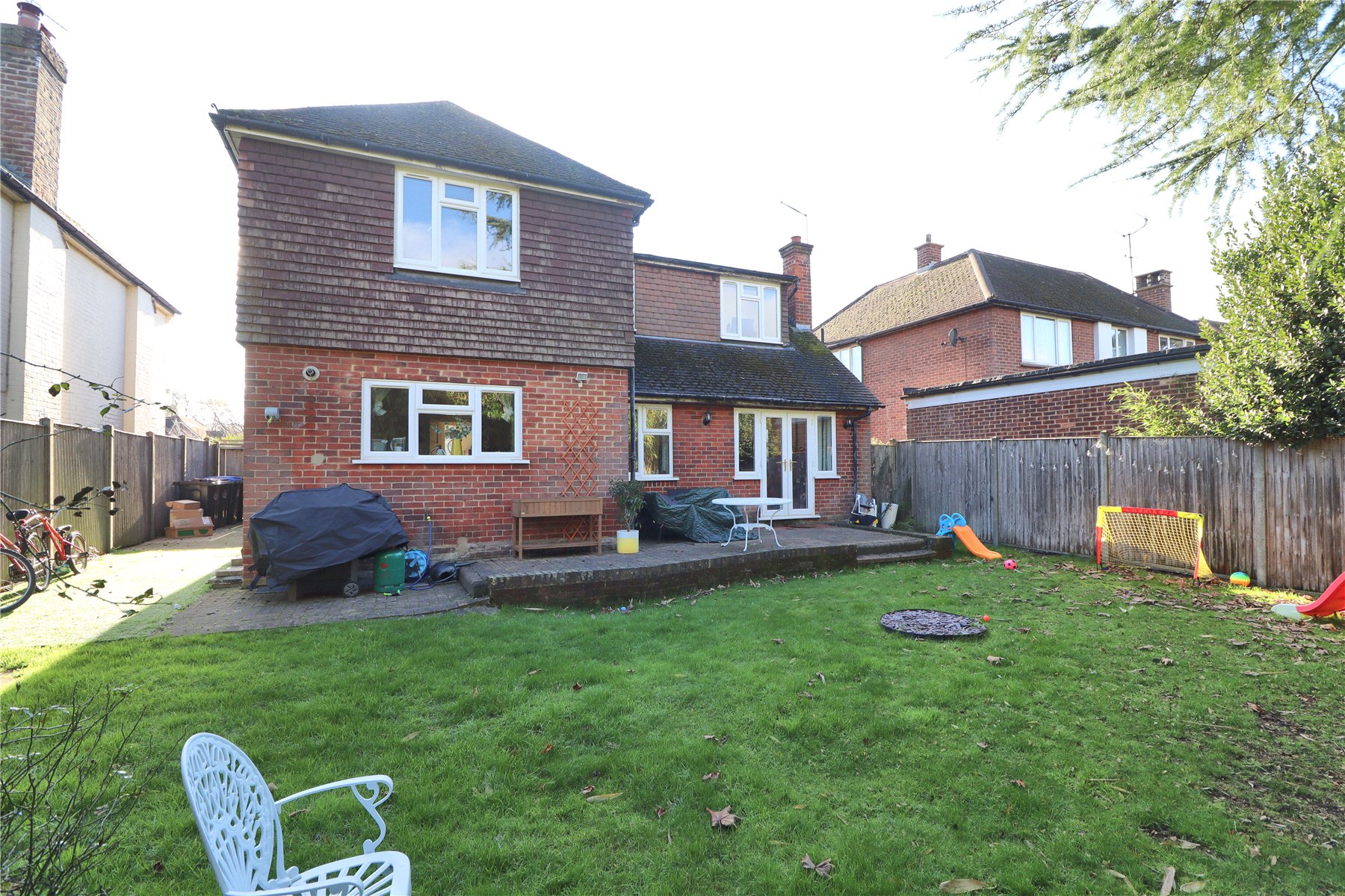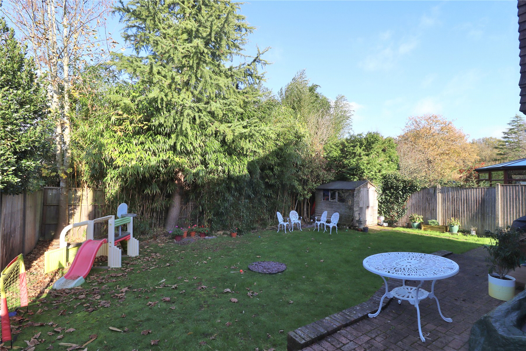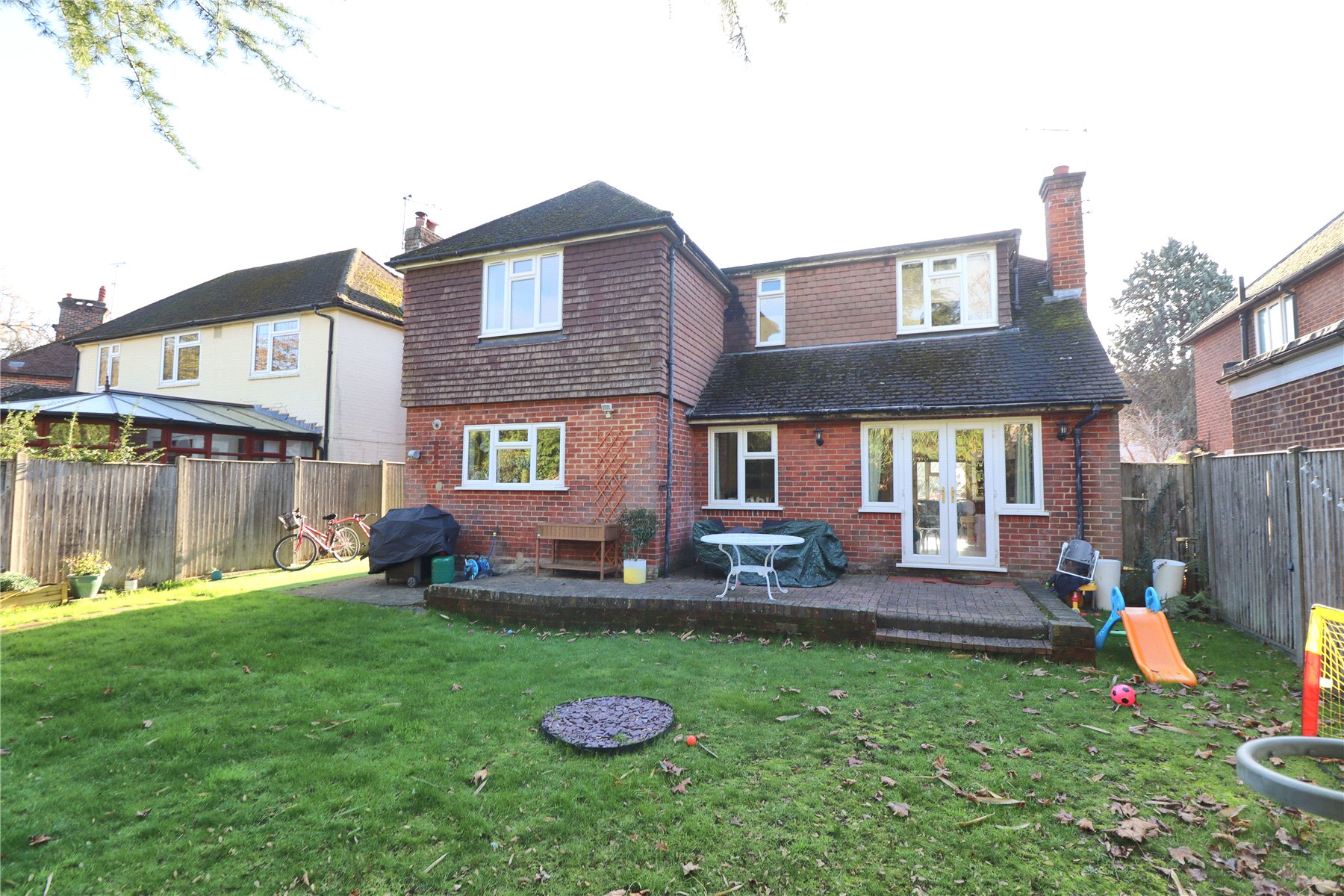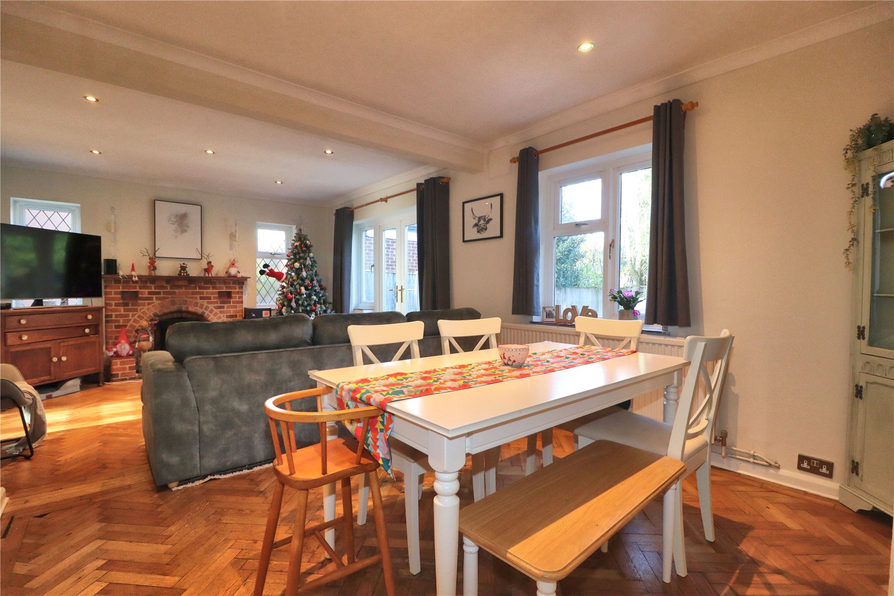 Offered to the market with no onward chain, this spacious detached chalet-style home provides flexible four/five bedroom accommodation with two/three reception rooms, ideal for family living or those seeking adaptable space.The ground floor features a bright rear-aspect living room with a charming brick fireplace, door to the garden, and a connecting sitting/dining room, offering excellent versatility for entertaining or relaxation. There is also a further front-aspect bedroom/reception room, a cloakroom, and a generous kitchen/breakfast room fitted with a range of units, integrated oven and gas hob, space for an American-style fridge/freezer, and access to the rear garden.Upstairs, there are four well-proportioned bedrooms and a family bathroom. The main bedroom enjoys a double-aspect outlook and benefits from wall-to-wall built-in wardrobes, providing ample storage.Externally, the property offers ample off-road parking via a block-paved driveway with double gates leading to additional side parking. The rear garden features a patio, lawn, and mature bamboo screening, creating a private and tranquil outdoor space.There is also potential to extend, subject to the usual planning consents.Situated in a quiet and sought-after cul-de-sac, the property is conveniently located close to local shops and within approximately one mile of Woking town centre and its excellent commuter links.