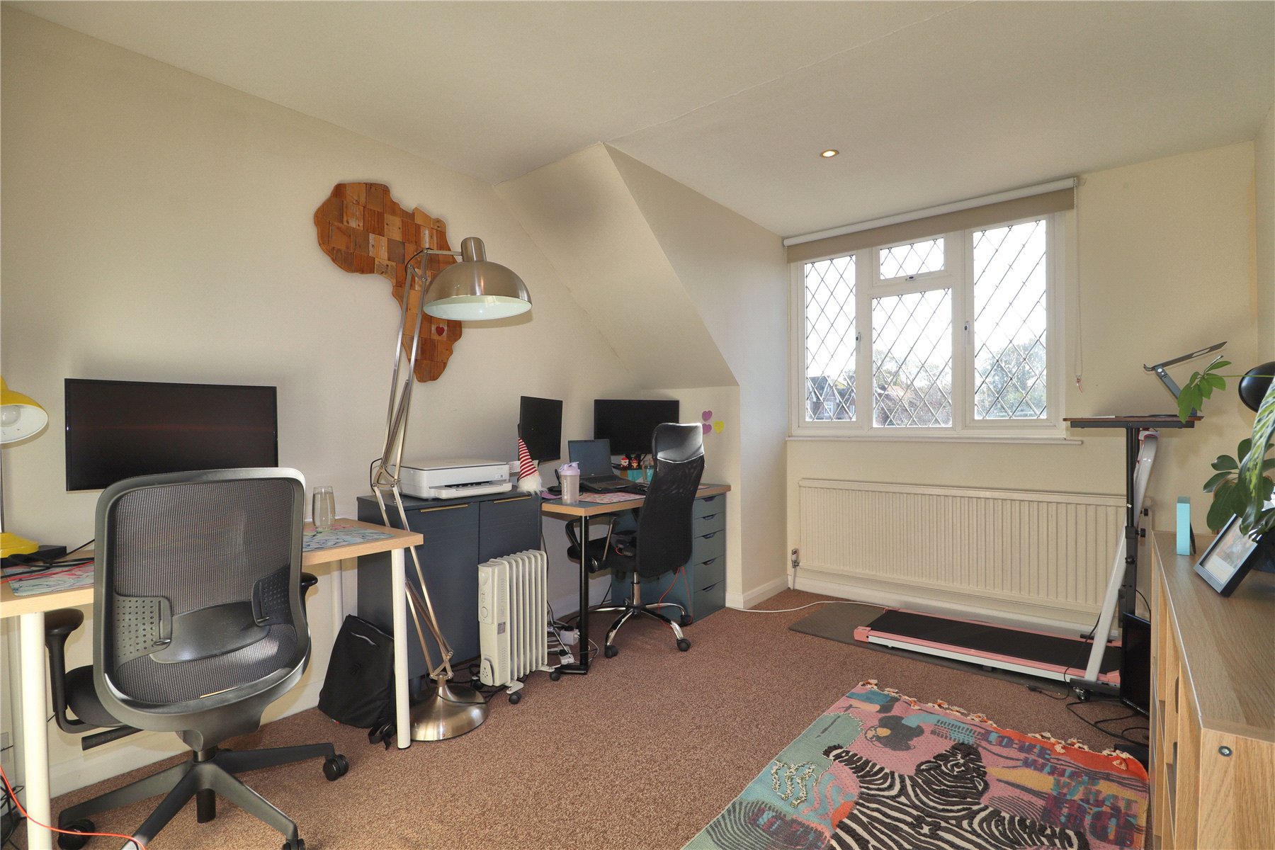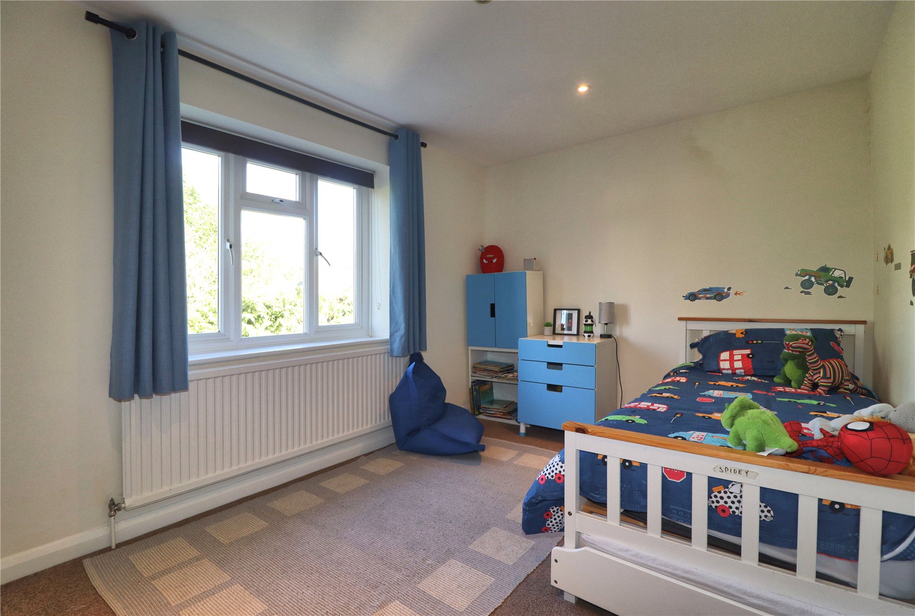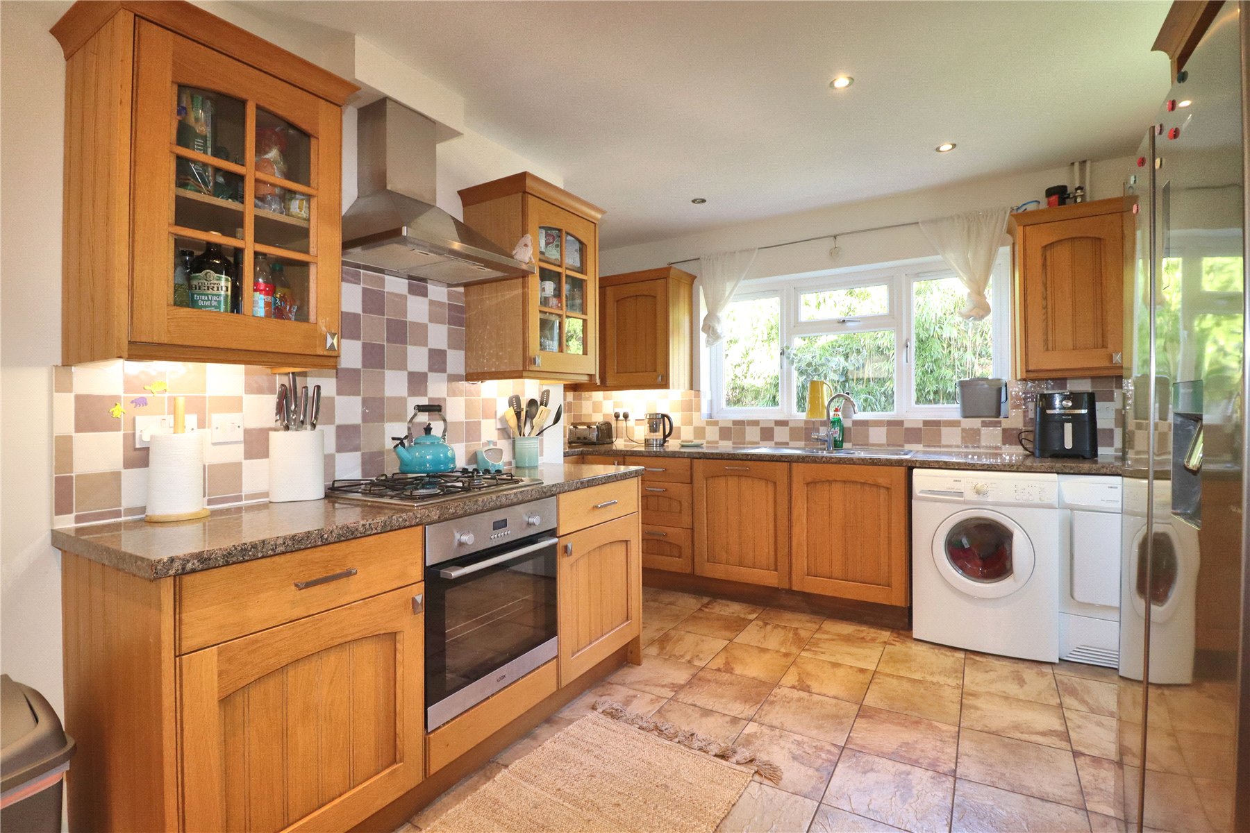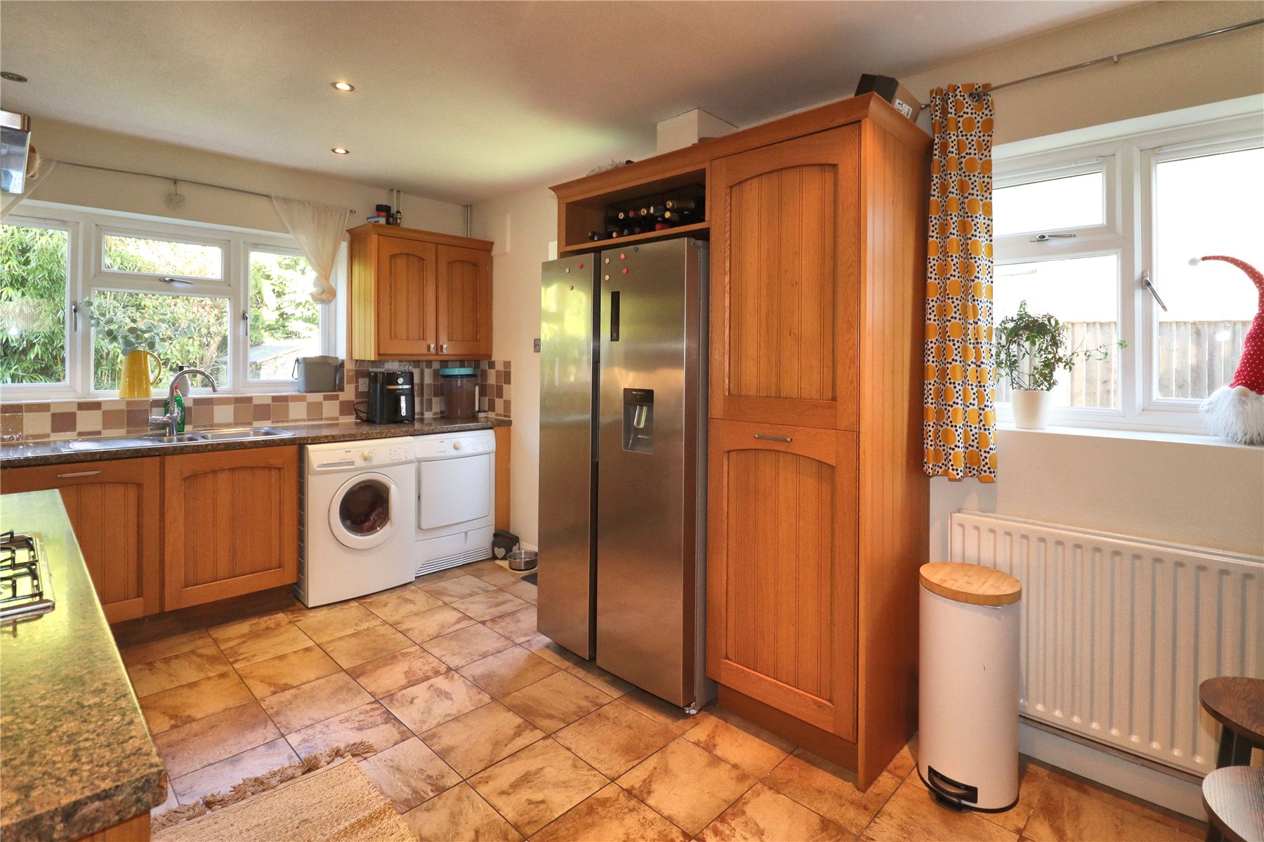 Offered to the market with no onward chain, this spacious detached chalet-style home provides flexible four/five bedroom accommodation with two/three reception rooms, ideal for family living or those seeking adaptable space.The ground floor features a bright rear-aspect living room with a charming brick fireplace, door to the garden, and a connecting sitting/dining room, offering excellent versatility for entertaining or relaxation. There is also a further front-aspect bedroom/reception room, a cloakroom, and a generous kitchen/breakfast room fitted with a range of units, integrated oven and gas hob, space for an American-style fridge/freezer, and access to the rear garden.Upstairs, there are four well-proportioned bedrooms and a family bathroom. The main bedroom enjoys a double-aspect outlook and benefits from wall-to-wall built-in wardrobes, providing ample storage.Externally, the property offers ample off-road parking via a block-paved driveway with double gates leading to additional side parking. The rear garden features a patio, lawn, and mature bamboo screening, creating a private and tranquil outdoor space.There is also potential to extend, subject to the usual planning consents.Situated in a quiet and sought-after cul-de-sac, the property is conveniently located close to local shops and within approximately one mile of Woking town centre and its excellent commuter links.