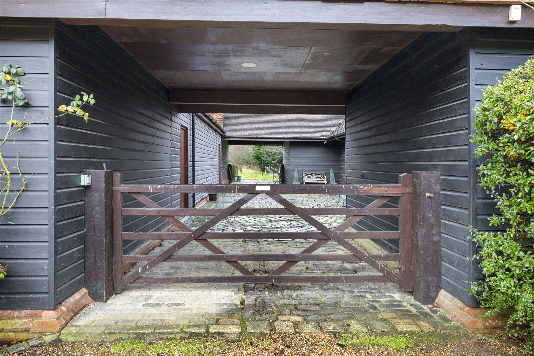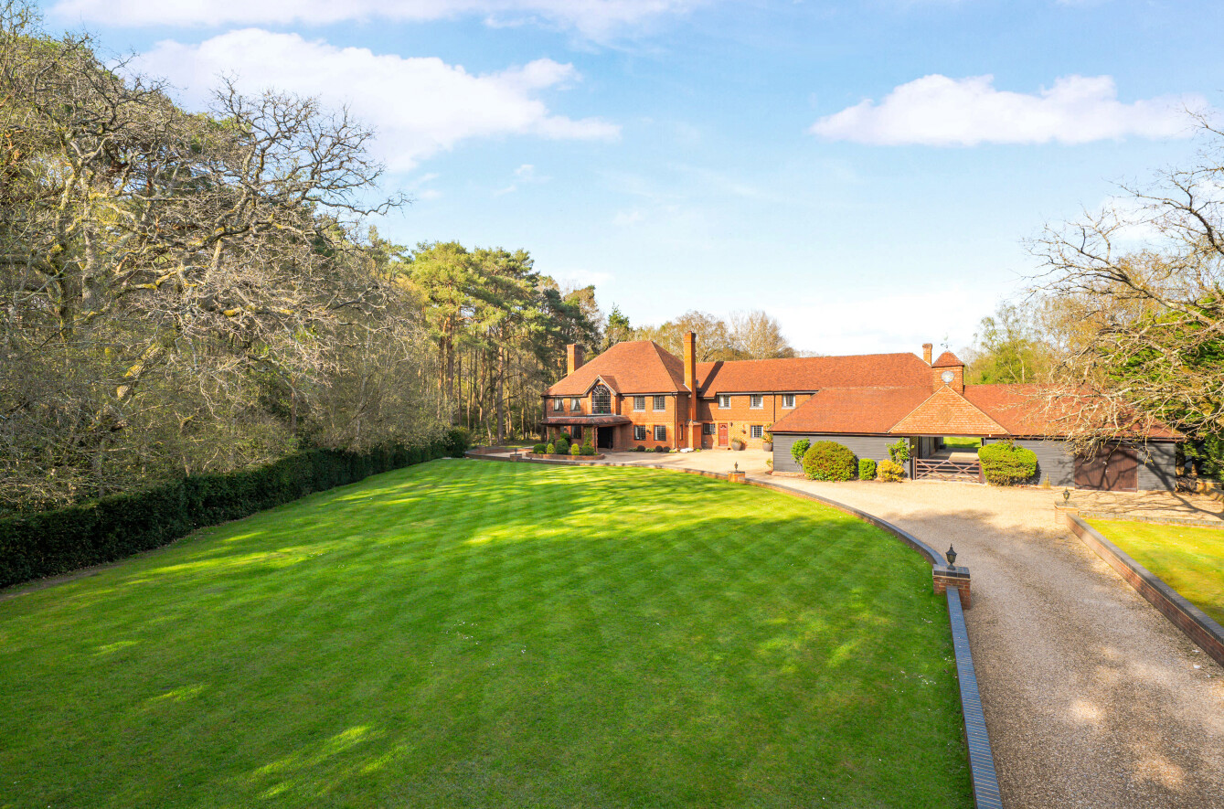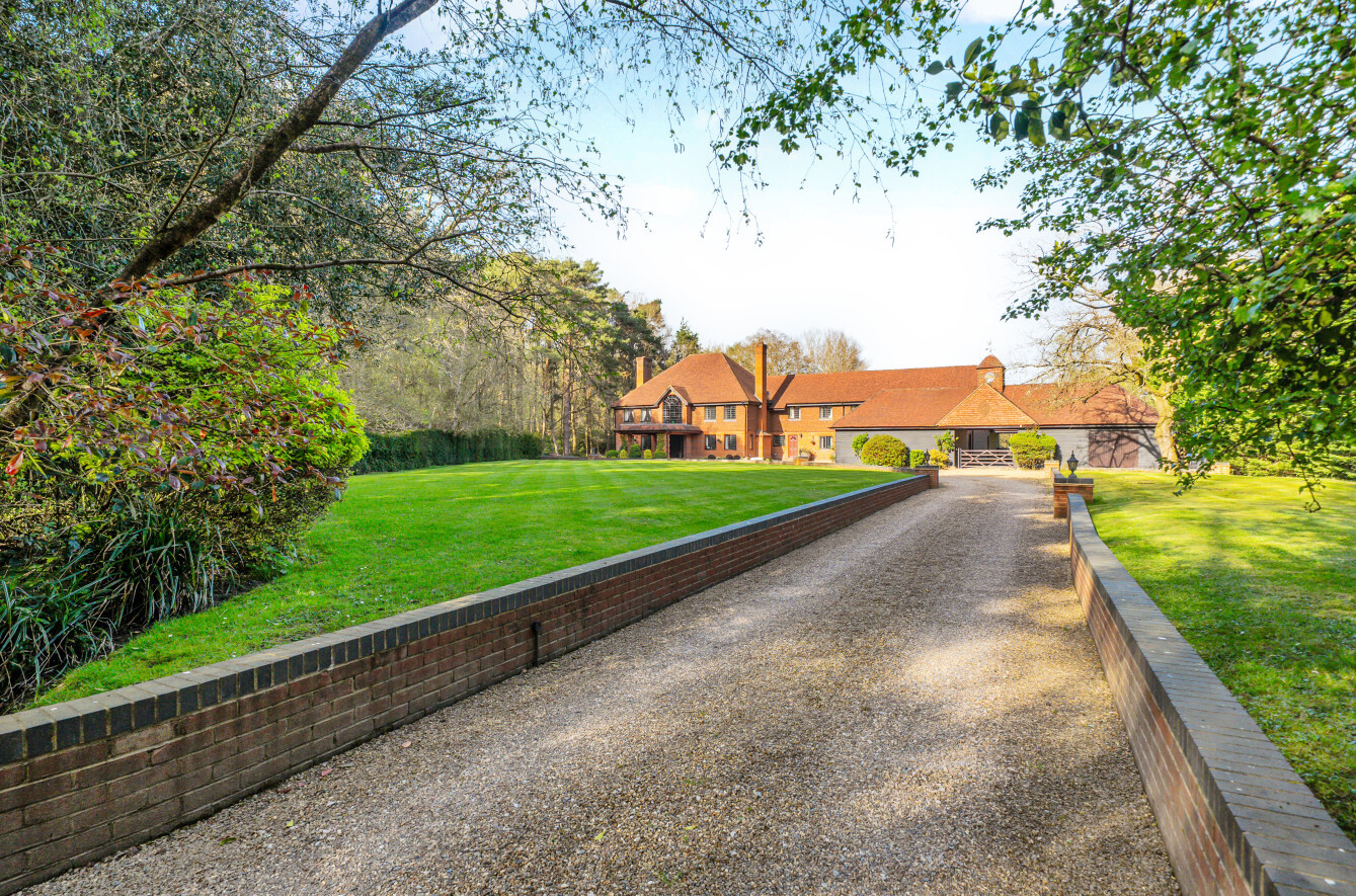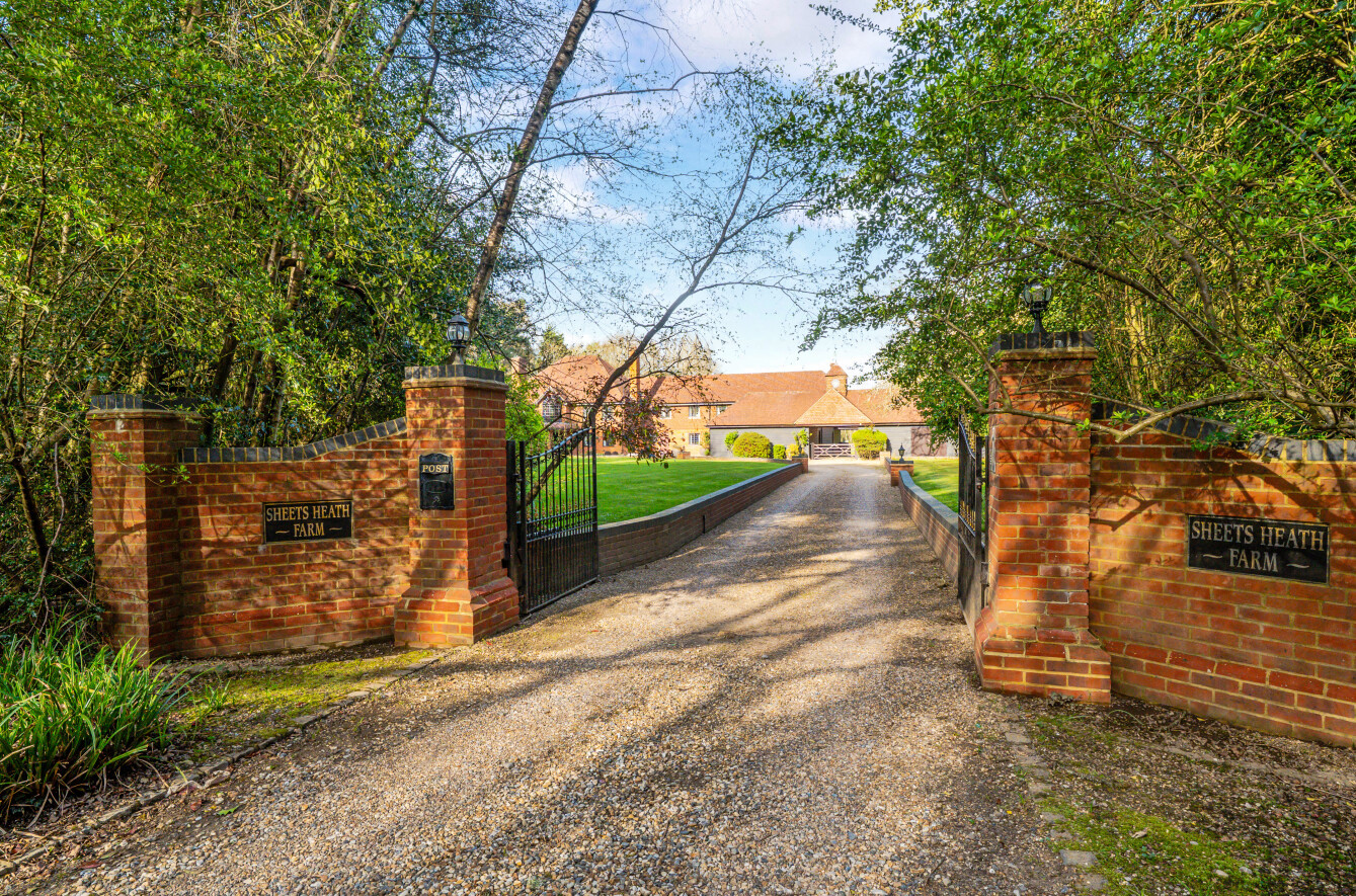 Cocooned within the leafy greenery of securely gated grounds of circa 5 acres, Sheets Heath Farm prompts an undeniable feeling of privacy and seclusion, hidden from the world by the natural beauty of statuesque trees. The wrought iron gates benefit from video entry and the distinguished red brick of their pillars is topped with stately lantern lighting and extends into the high walls that encompass the capacious front lawns.