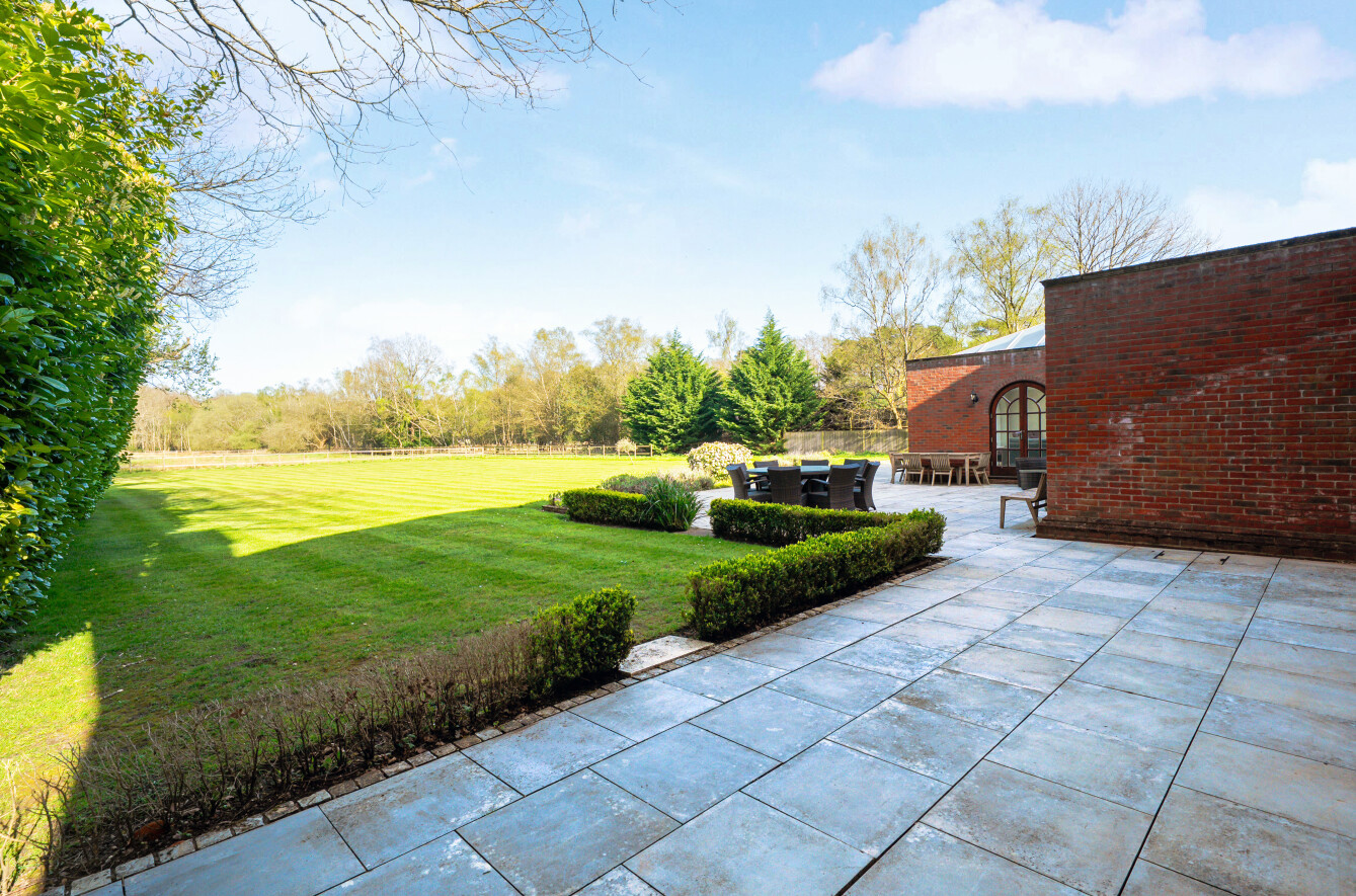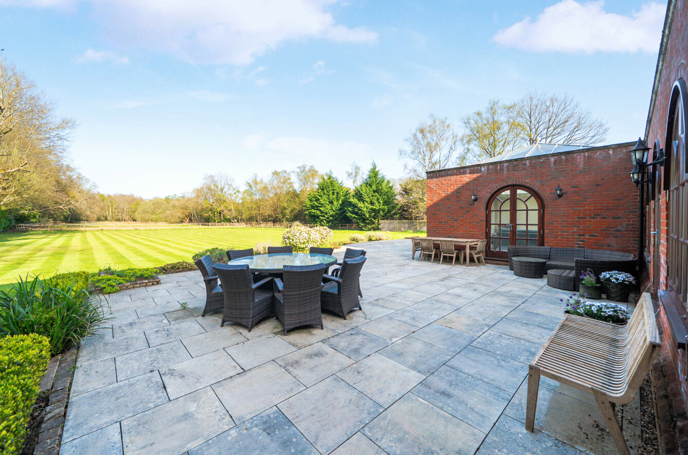 To the rear of this prestigious country retreat the array of French doors immerses the ground floor with halcyon panoramas. The timeless simplicity of a vast lawn reaches down to the adjacent paddocks, defined by rustic farm fencing that when sitting enjoy al fresco entertaining on the large terracing lets your gaze wonder uninterrupted to the bordering woodland trees that give a cherished degree of seclusion.
