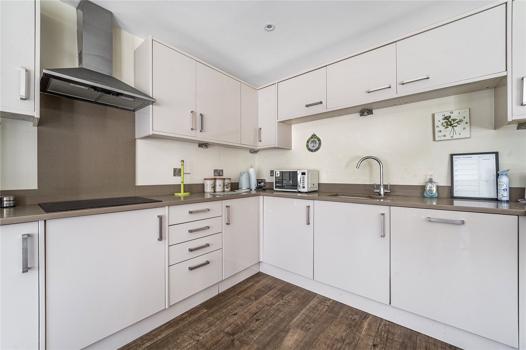 The property itself offers spacious accommodation extending to approximately 830 sqft and is presented in excellent condition throughout. The main living area is open plan and incorporates the kitchen, dining room and living area, enjoying views over fields and the well-maintained communal gardens. The well-appointed kitchen has been fitted with a range of high gloss, base and eye level units with integrated appliances and composite stone worktops.