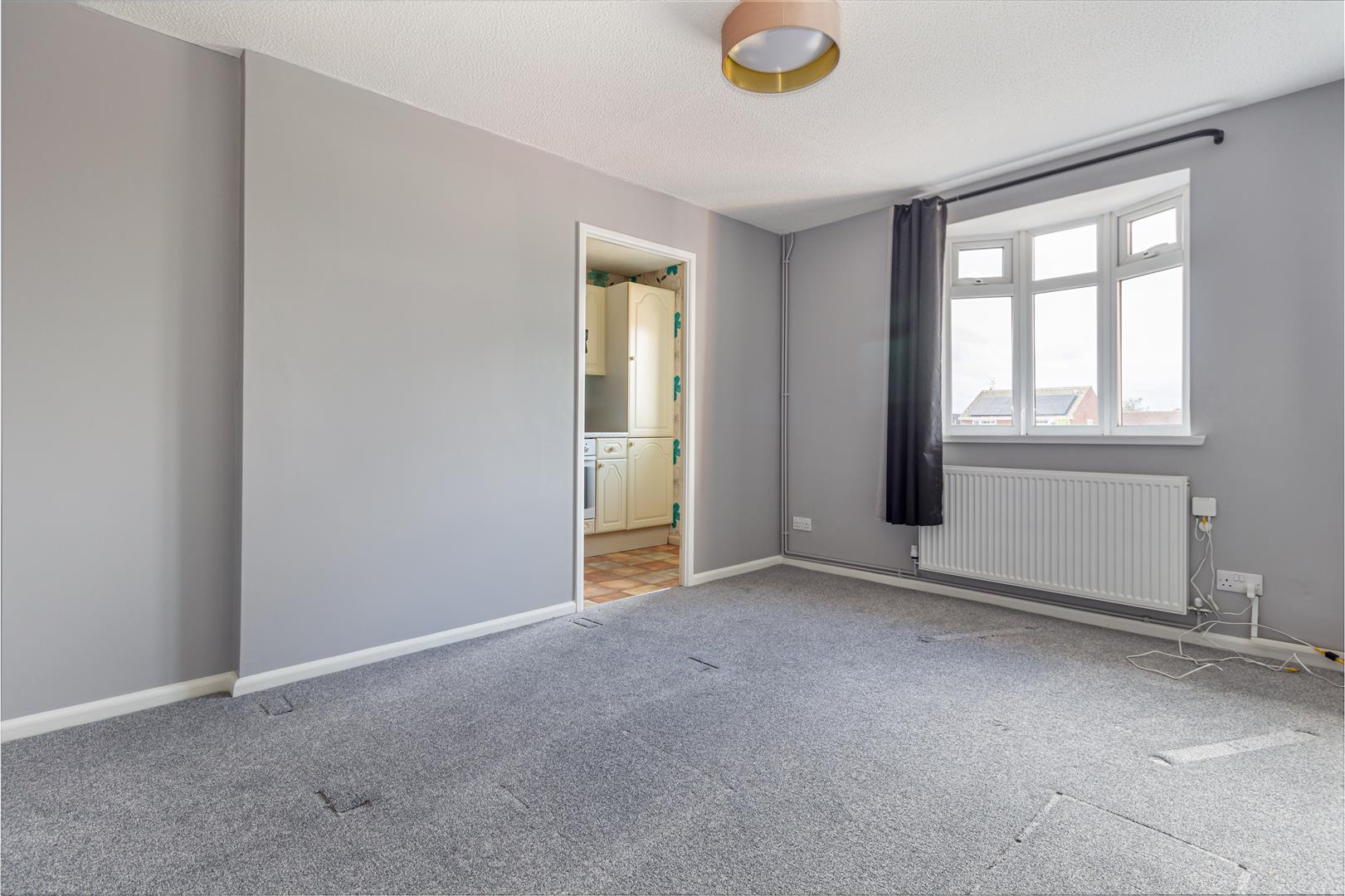 Living Room - Glass wooden door. Carpet flooring. Double glazed window to front aspect. Radiator with thermostat. Ceiling light point. Opening into the kitchen.