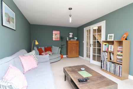 Dining Room - 3.57 x 2.86 (11'8" x 9'4") - Currently used as a playroom, this versatile space features rear-facing uPVC double-glazed French doors that open out to the garden. It benefits from a central heating radiator and is finished with laminated wood flooring, making it both functional and inviting.