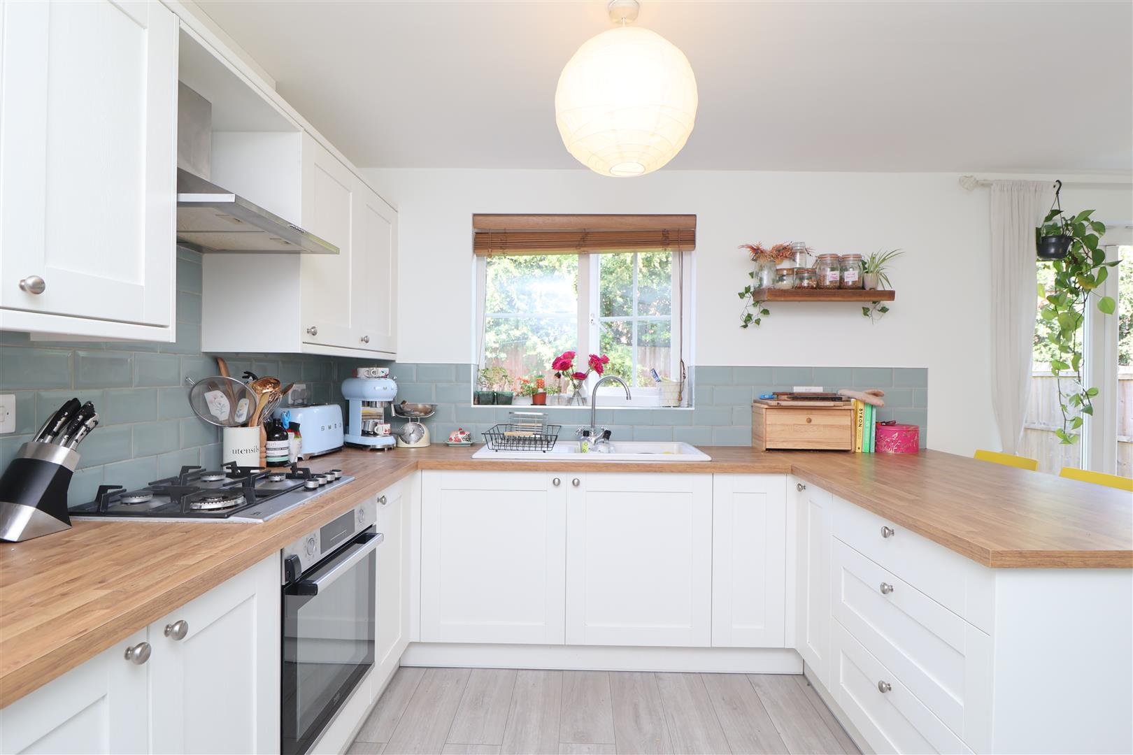 Kitchen/Diner - 3.57 x 5.22 (11'8" x 17'1") - The kitchen features a rear-facing uPVC window and is fitted with cream shaker-style wall and base units, complemented by wood-effect worktops. A white composite sink and drainer with a stainless steel mixer tap sit beneath the window. Integrated appliances include a gas hob with extractor above and an electric oven. The space opens into a dining area with French doors leading to the rear garden, a door to the utility room, and is finished with stylish laminate flooring throughout.