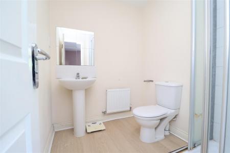 Downstairs W/C - A practical ground floor cloakroom featuring a low flush WC and pedestal wash basin. Finished with laminate flooring and complemented by an obscure UPVC double glazed window to the front elevation, allowing for both privacy and natural light.