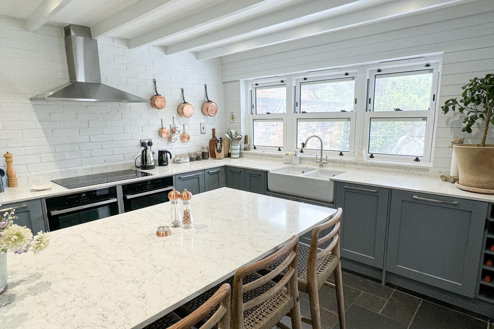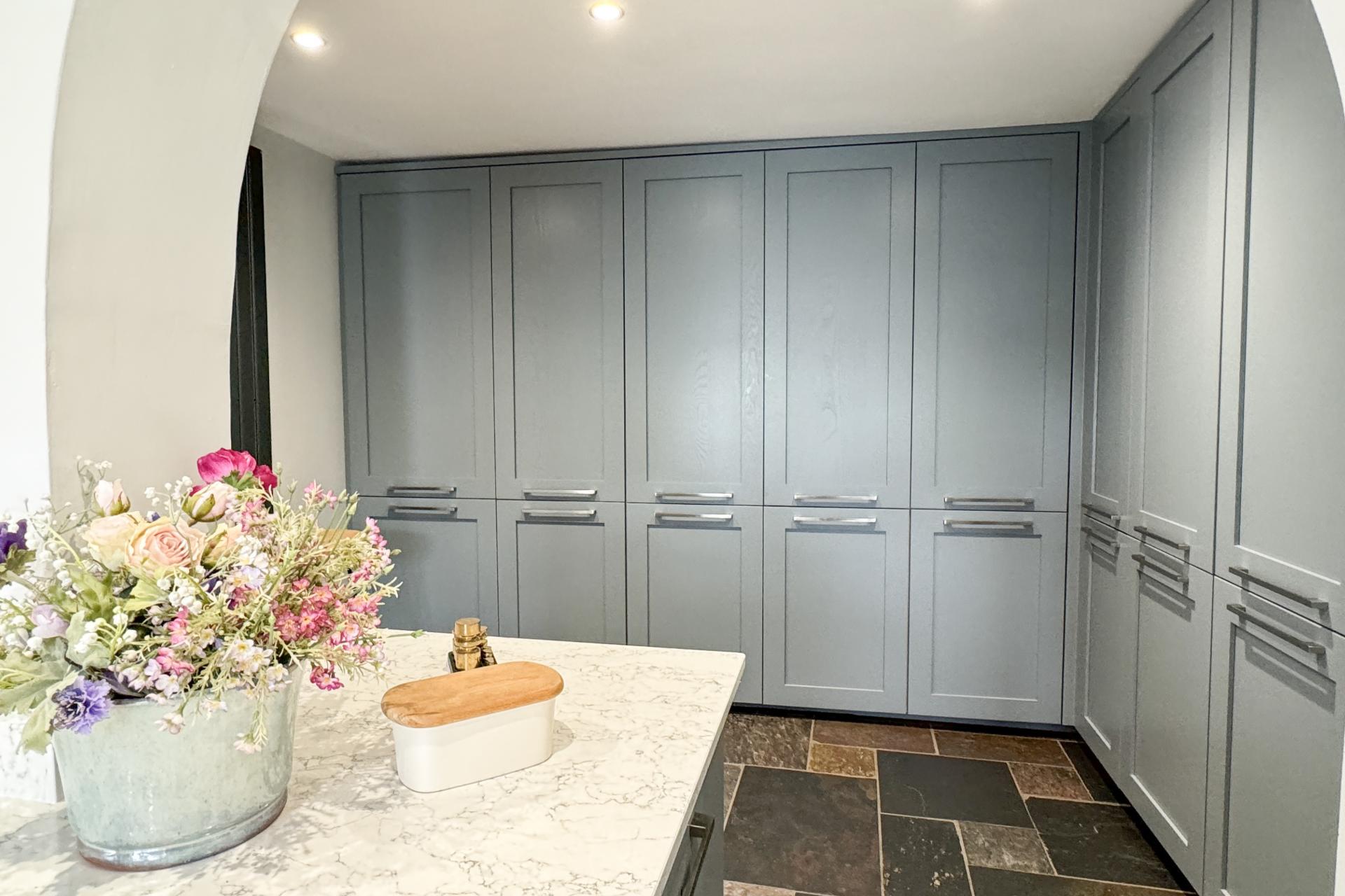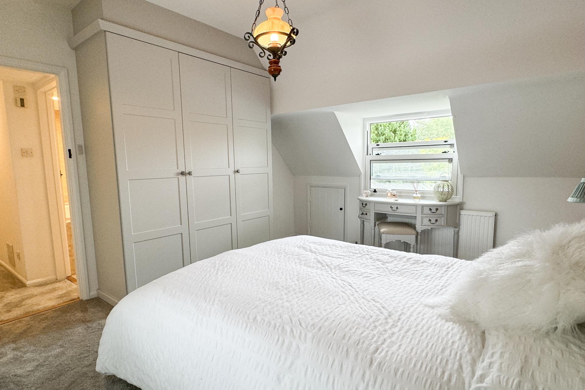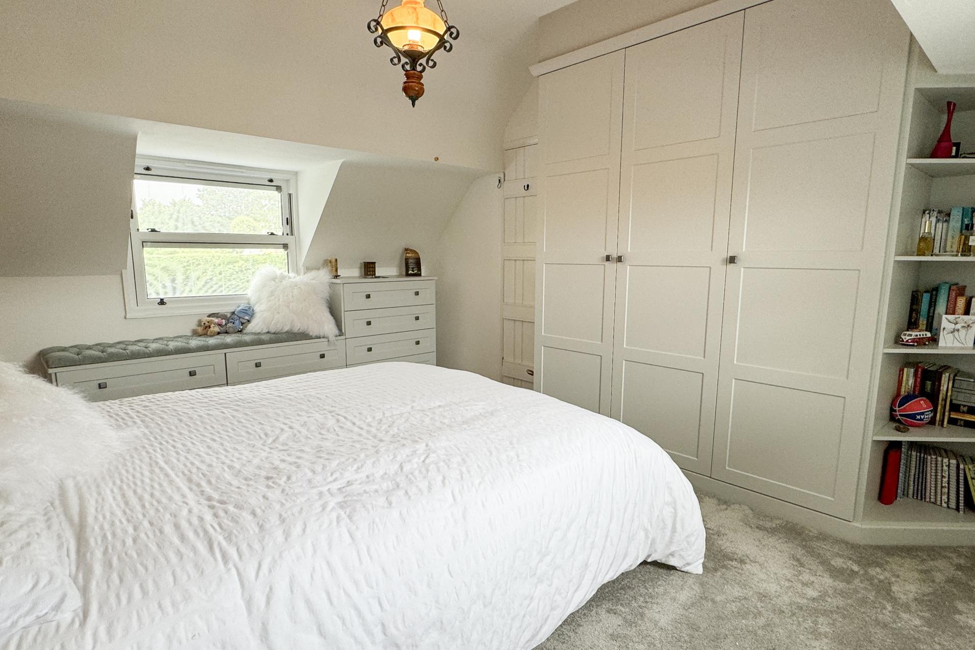 The sitting room exudes a homely feel with its Scandinavian cast iron wood and coal-burning inglenook stove, bay window to the front, and the added comfort of underfloor heating. At the rear of the house, the 16-foot family room with travertine stone flooring, benefits from underfloor heating and features a Scandinavian inset log burner with stone surround and French doors that lead out to the garden. The heart of the home is the kitchen/breakfast room, boasting Nordic blue Shaker-style fitted kitchen with a central island, bespoke larder cupboards, and two top of the range Neff ovens and double Butler sink. Conveniently located off the hall, adjacent to the kitchen, is a utility room. This floor is completed with a cloakroom. The layout is perfect for modern family living, with light-filled, spacious rooms that flow seamlessly for entertaining.