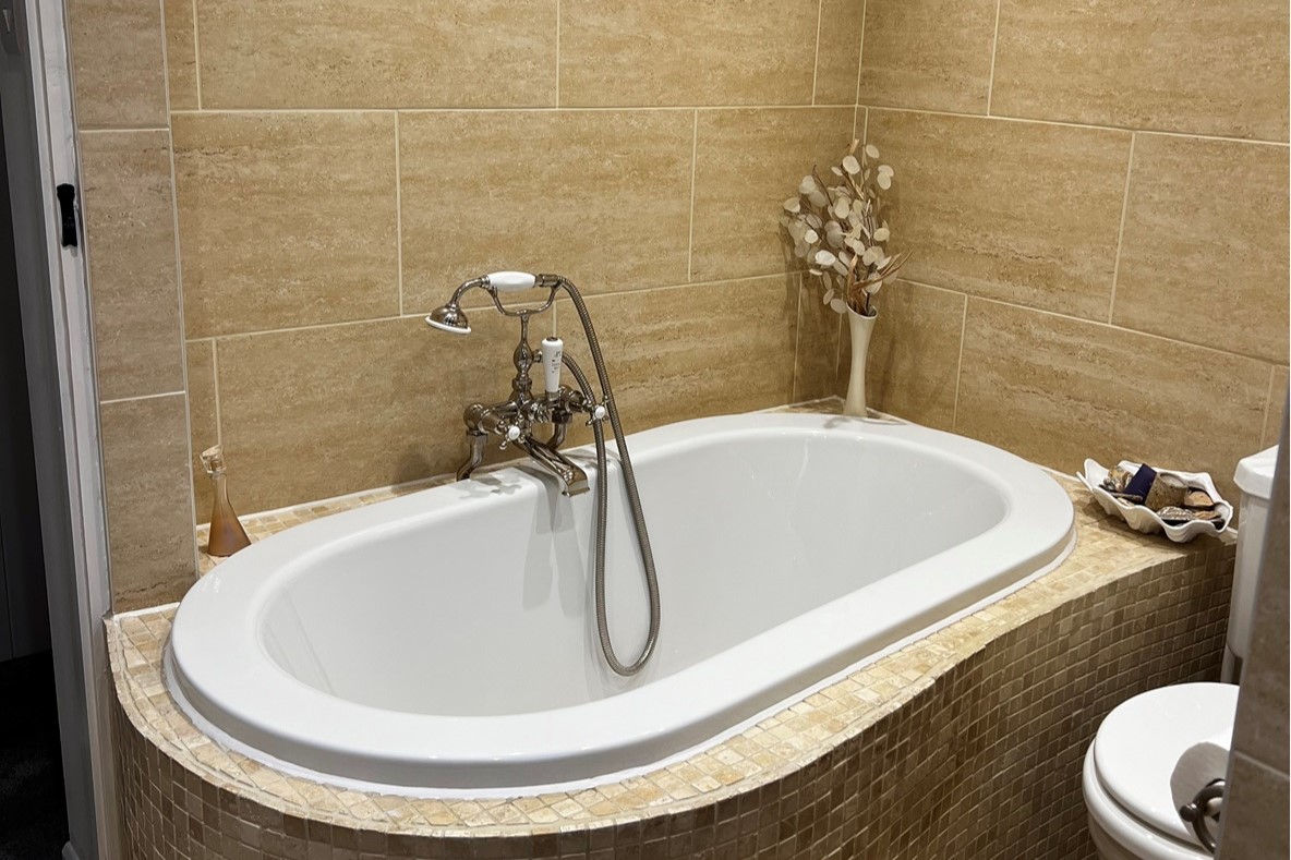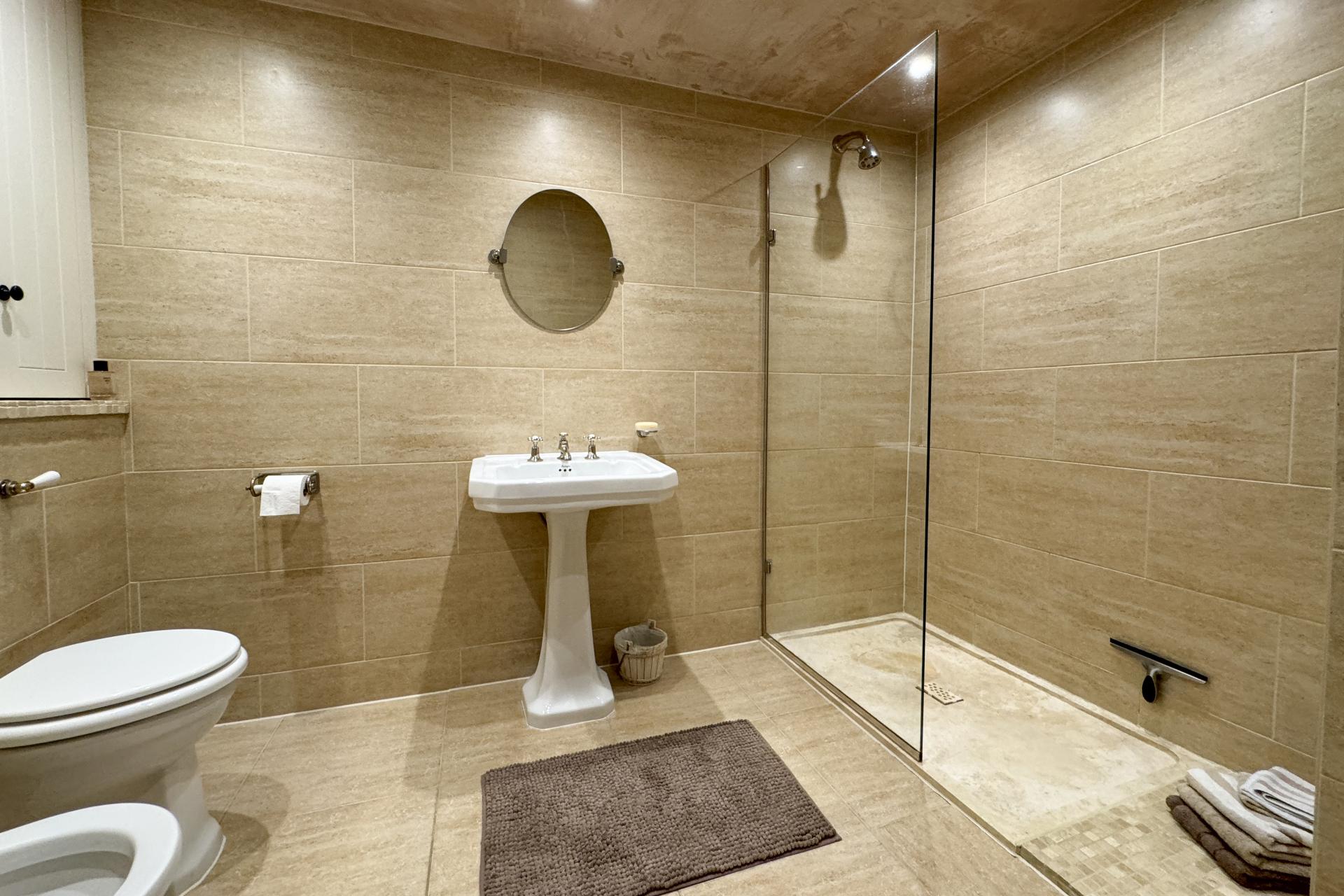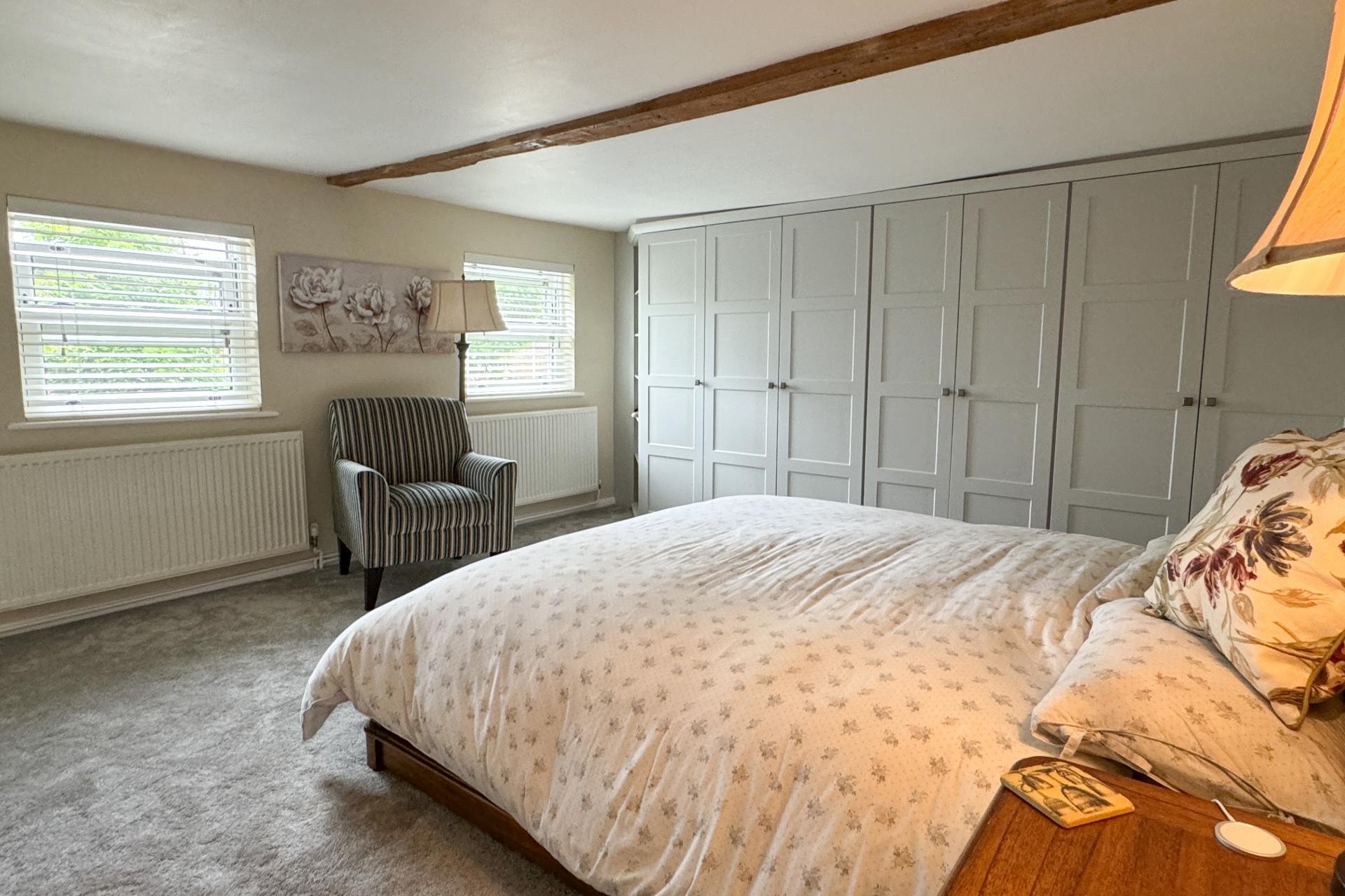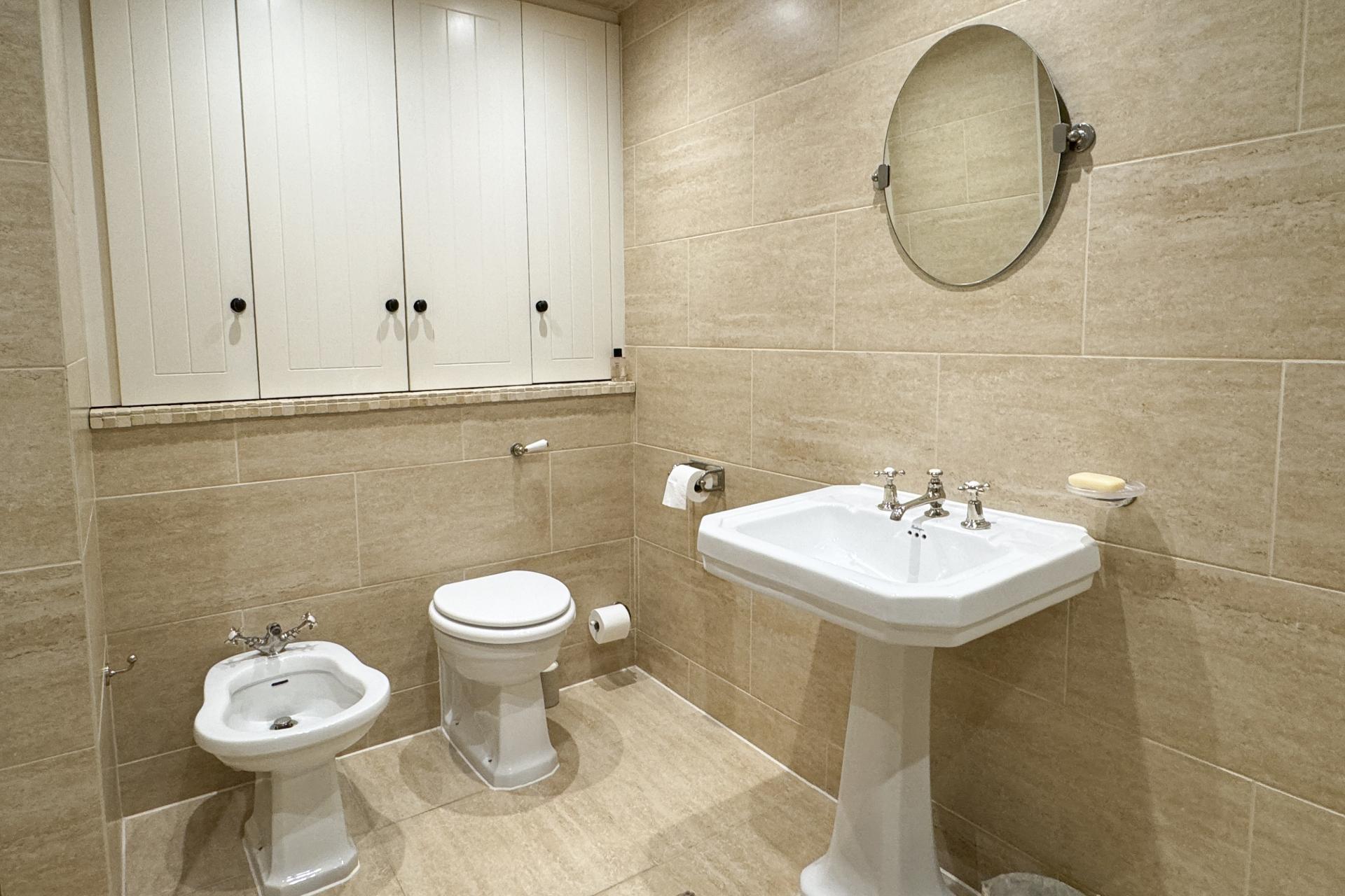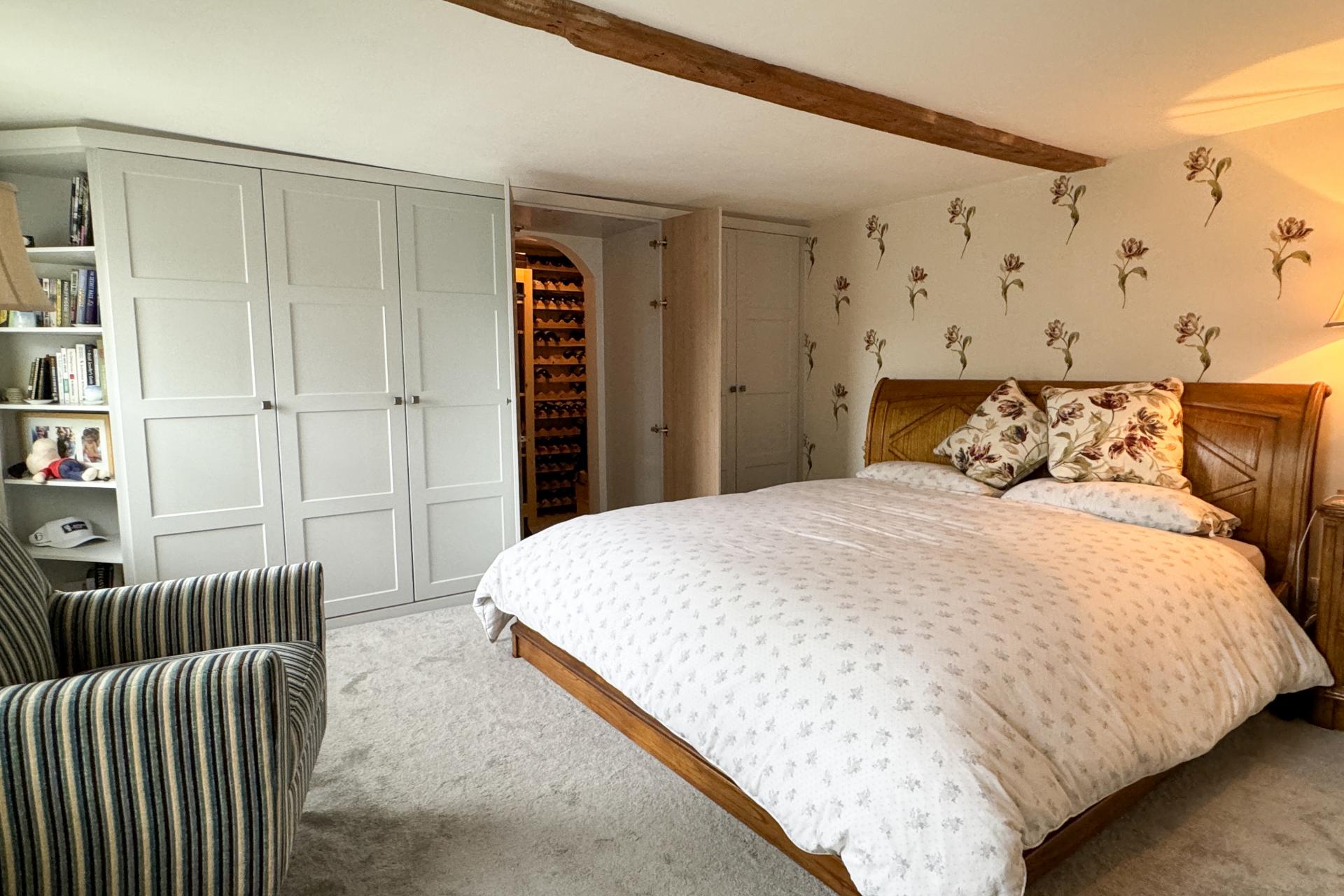 Upstairs, accessed by a wooden open-plan staircase with wrought iron banisters, are four double bedrooms. The dual-aspect master bedroom spans the width of the house, and the landing features built-in wardrobe space. The second bedroom has a large closet with capped-off plumbing, allowing for the potential addition of an ensuite but currently serves as a hidden wine cellar. The two bath/shower rooms are exquisitely refitted with designer taps and sanitary ware and underfloor heating. The master bathroom includes , a Victorian-style heated towel rail, and a built-in bath with a mosaic tiled surround, while the other bathroom features a handcrafted bespoke travertine shower enclosure with matching tiles.