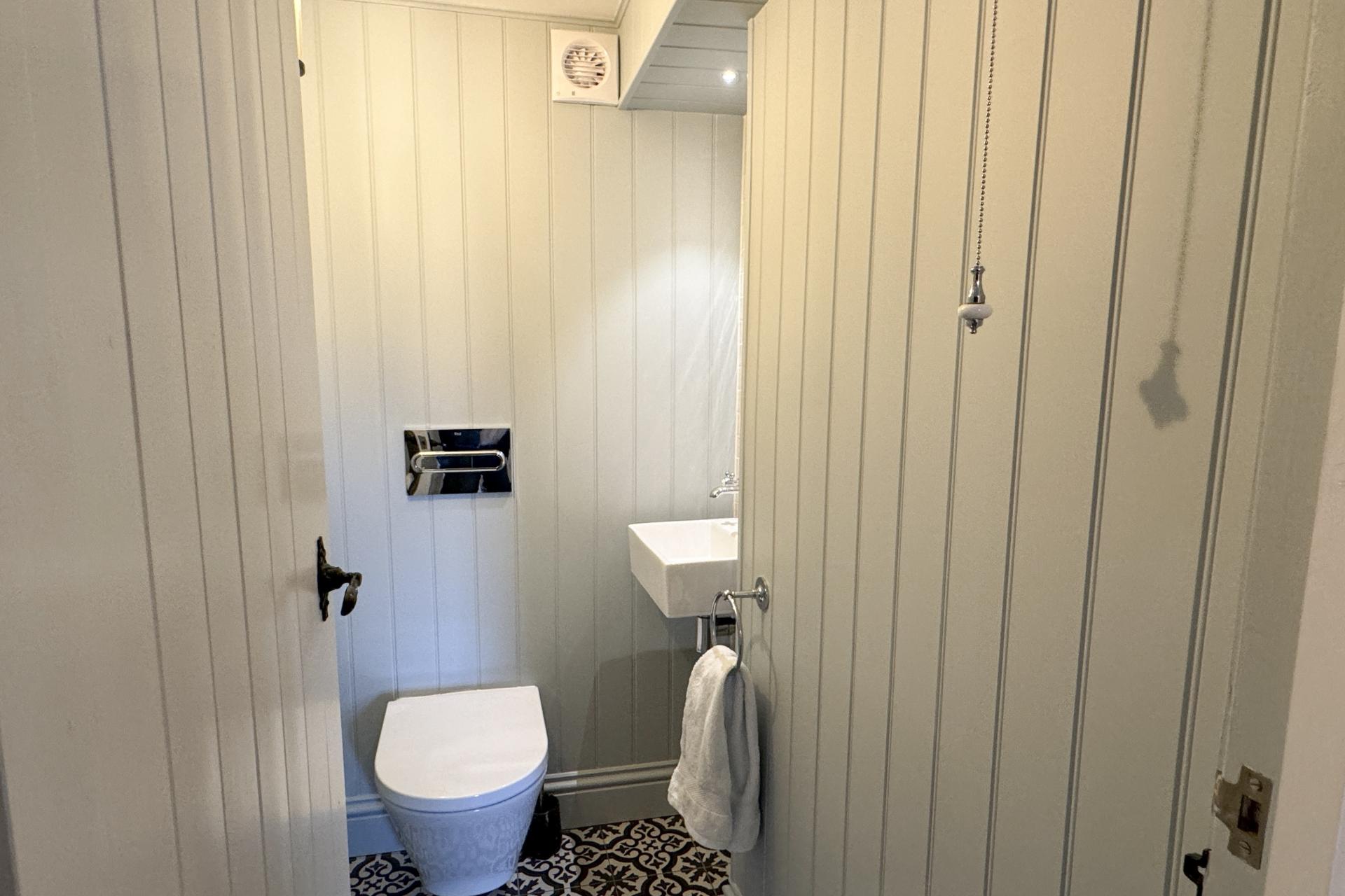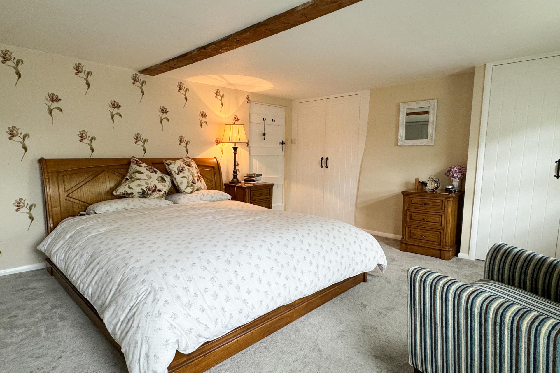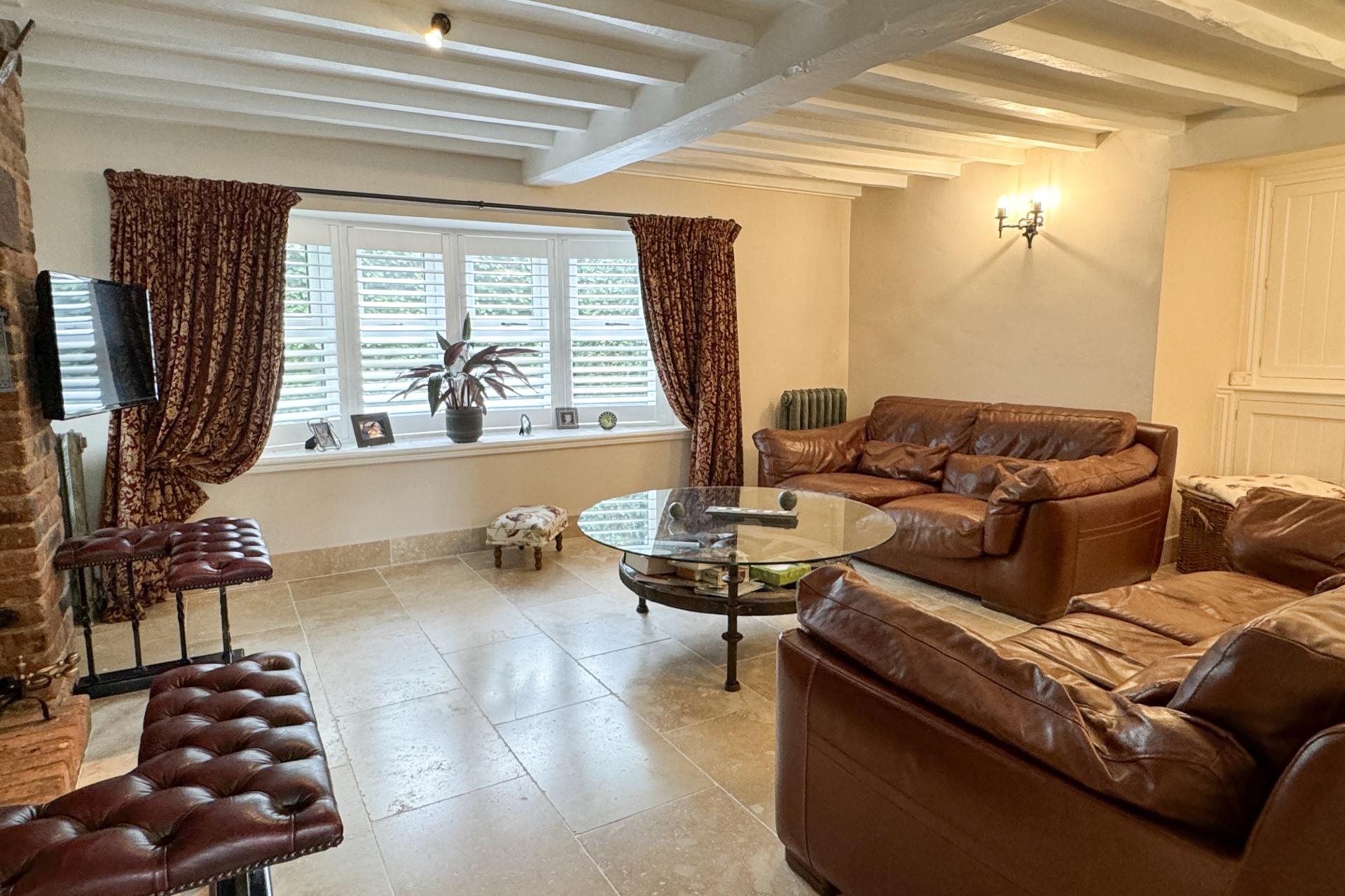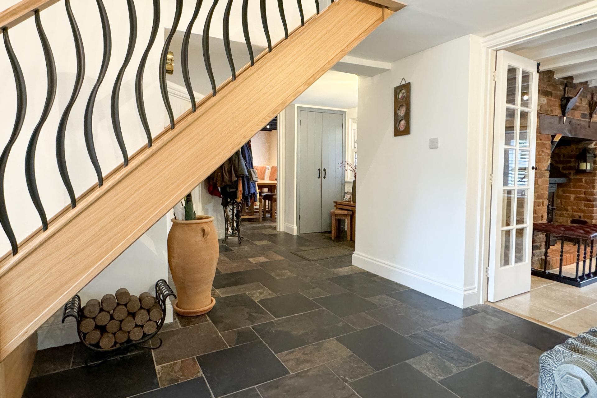 Upon entering the house through a recessed porch, you are welcomed into a spacious L-shaped entrance hall with a tiled flagstone slate floor that extends into the dining room. The hall provides access to all principal rooms and features Victorian-style cast iron radiators, a design element carried throughout the home. Wooden interior doors with wrought iron handles and fixings add to the cottage's rustic charm. The dining room, with its stone flooring and exposed beams, overlooks the front garden.