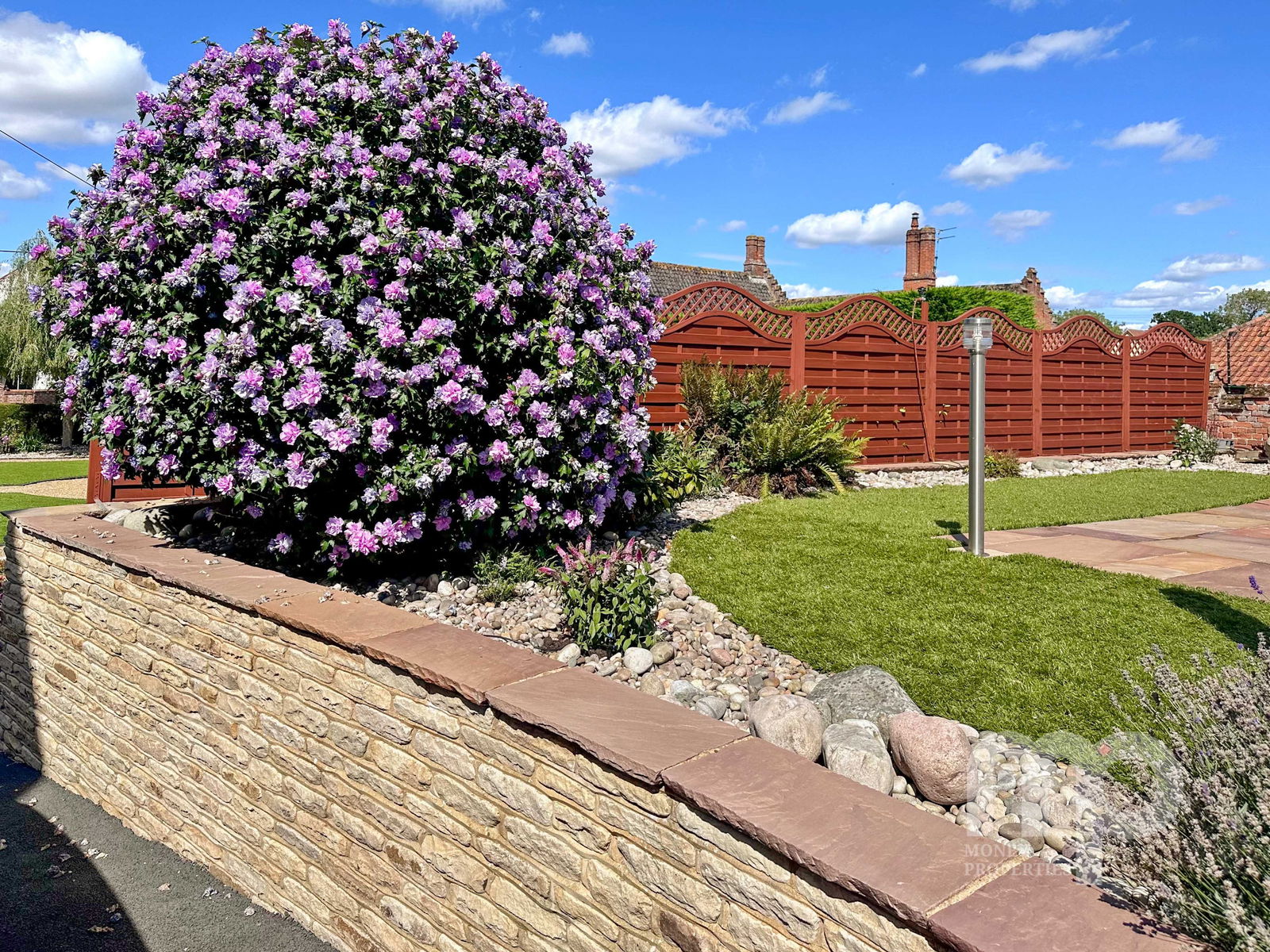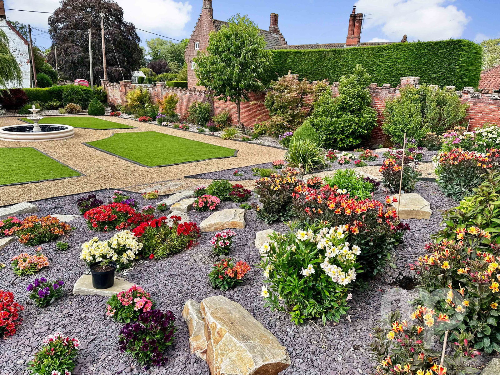 - The landscaped gardens include water features, Koi carp pond, well stocked borders and artificial grass