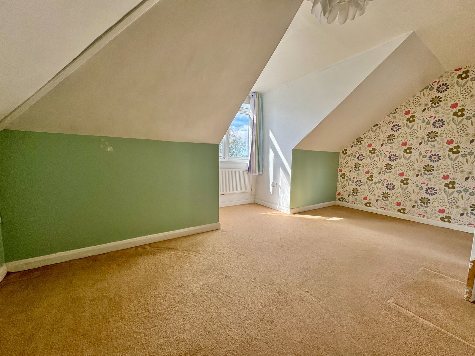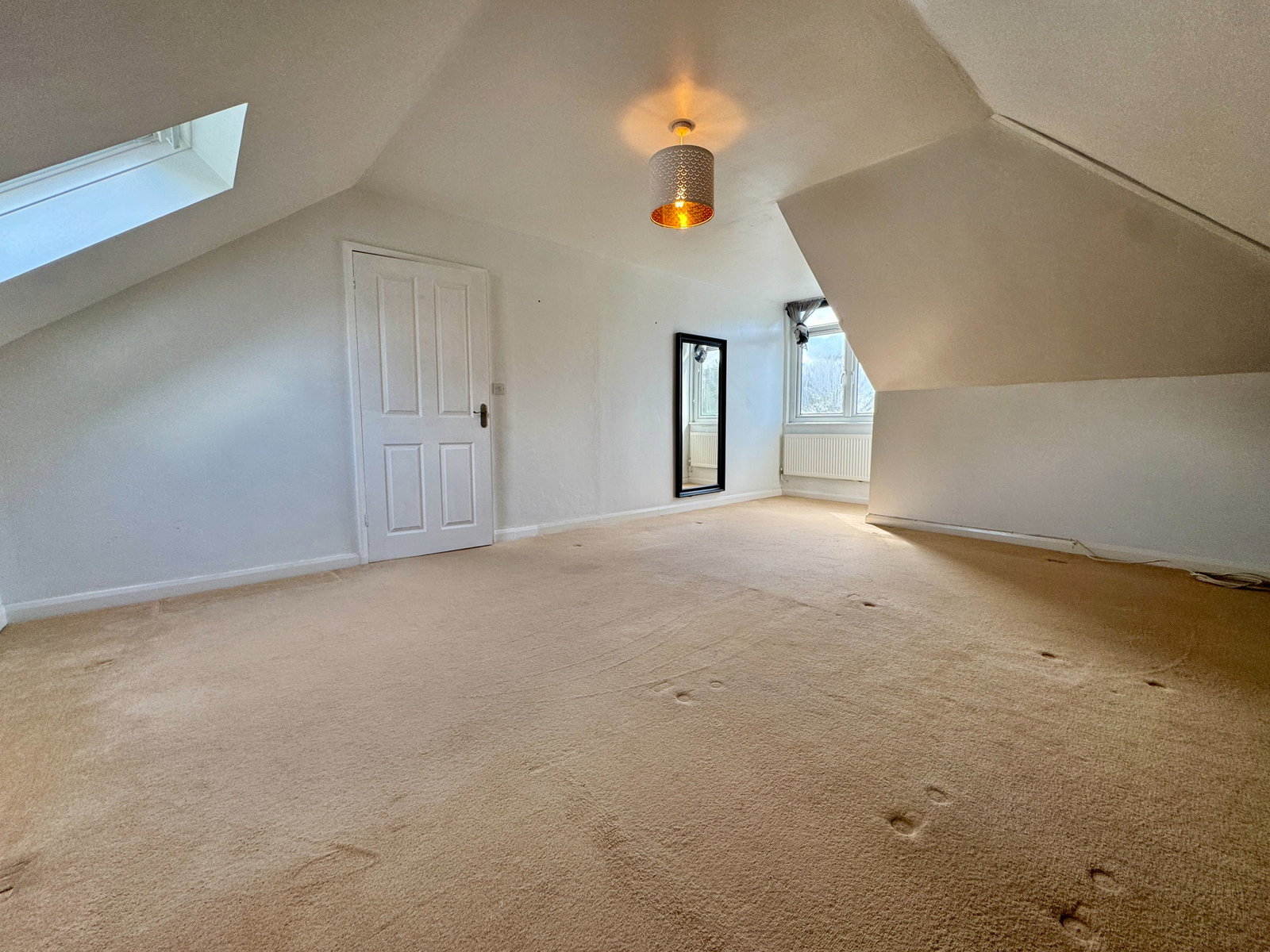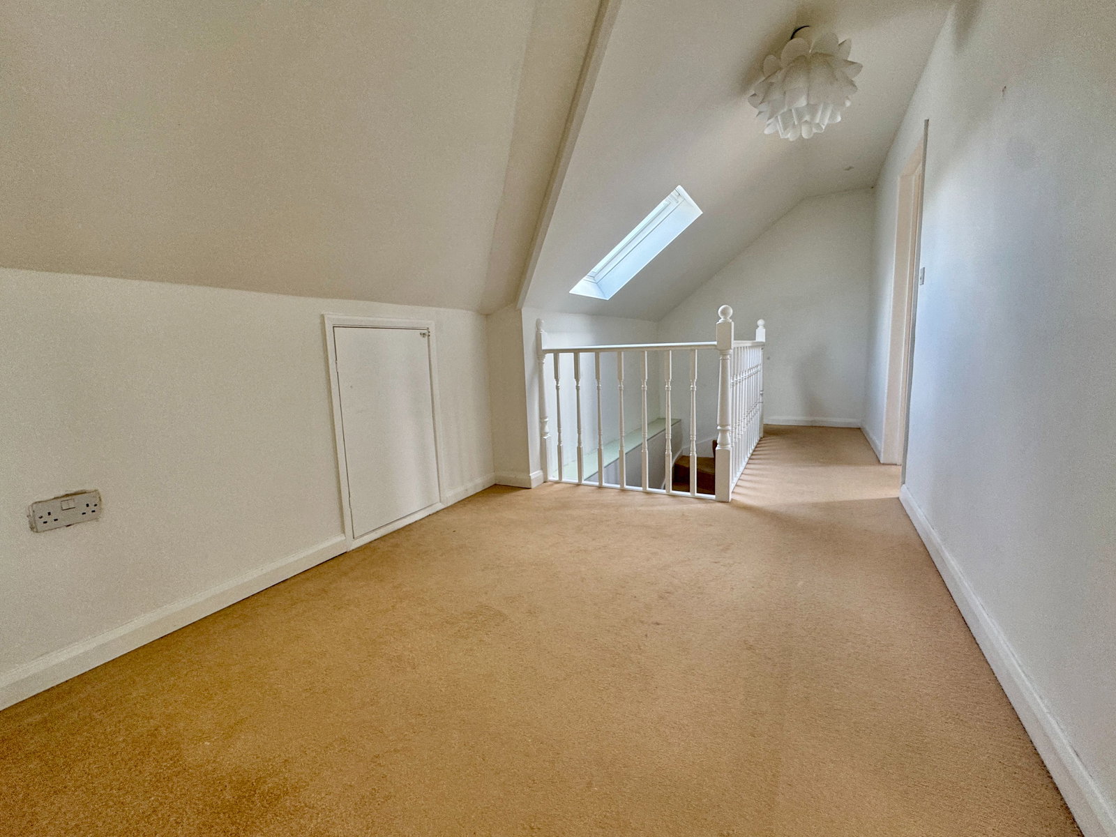 From the main hallway, carpeted stairs ascend to the first-floor landing, which benefits from Velux windows to the front elevation, and a painted handrail with spindles. Bedroom one is a spacious double room with windows to both the front and rear elevations, enjoying far-reaching views. Bedroom two is an L-shaped double room with a window overlooking the rear garden. The shower room is fitted with an oversized shower cubicle, a pedestal wash hand basin with tiled splashbacks, a low-level WC, and a Velux window.