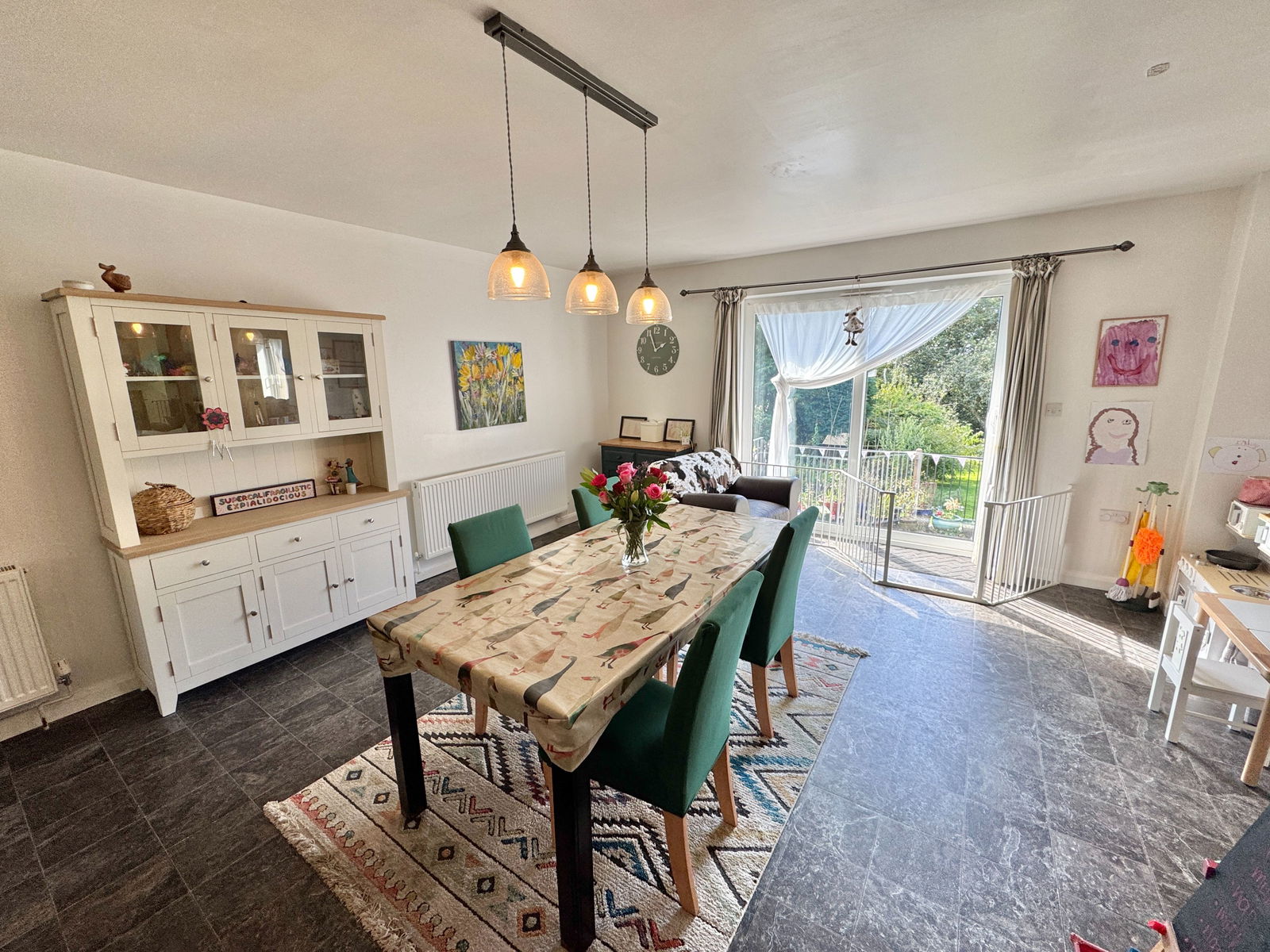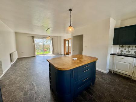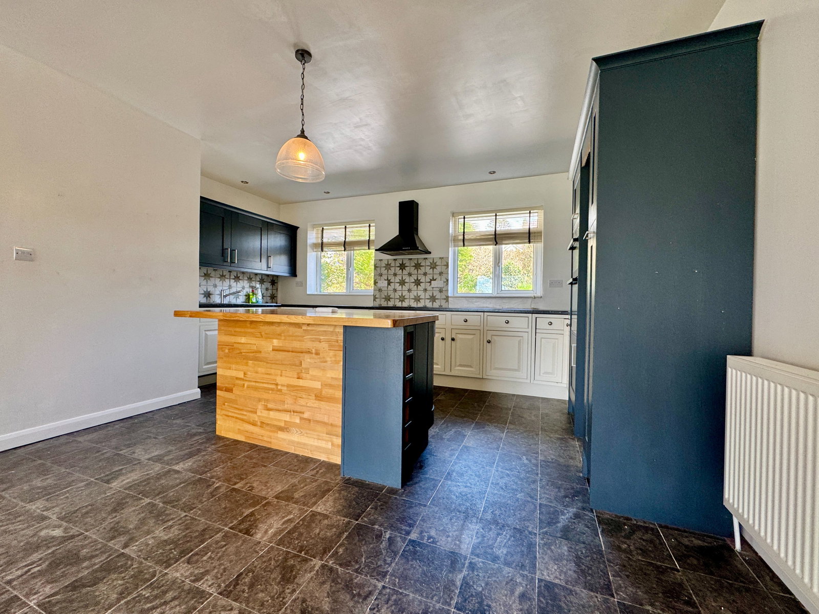 The spacious kitchen/dining room has further patio doors leading out to the garden. The kitchen is fitted with a matching range of base and eye-level storage cupboards, post-formed and roll-top work surfaces, and a breakfast bar with a solid wood worktop, a four-burner Zanussi induction hob, a filter canopy, a Zanussi oven, an integrated dishwasher, and space for a fridge freezer.