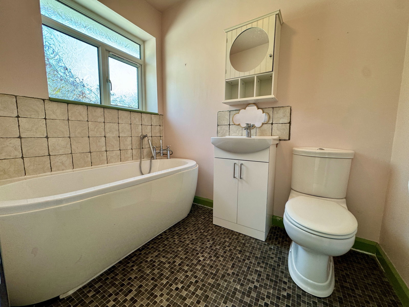On the ground floor, a doorway leads to the bathroom, which is fitted with a matching white three-piece suite, comprising a low-level WC, a pedestal wash hand basin with storage beneath, a double-ended bath with a shower mixer tap, and a chrome towel rail.