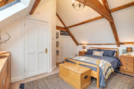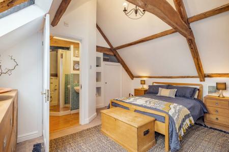The second floor offers two further bedrooms, both with with vaulted ceilings and exposed timbers, built in eaves storage and cupboards. Bedroom two has roof windows and delightful views over the rear garden and countryside beyond. This bedroom also includes built-in storage and an ensuite shower room.