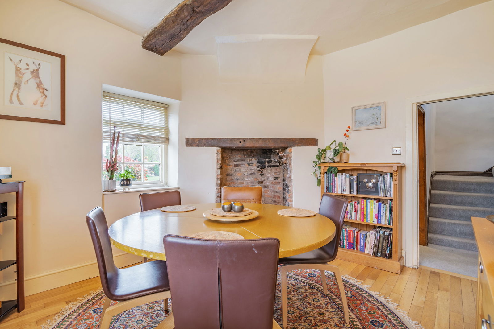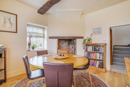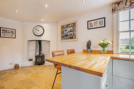 The dining room is light filled having windows to the front and side elevations, oak flooring and a feature fireplace. The breakfast kitchen is fitted with "Shaker style" units and integrated appliances including a Rangemaster cooker with induction hob, dishwasher, washing machine, and space for a fridge/freezer. The kitchen features oak worktops, a Belfast sink and views over the rear garden. There is a practical breakfast bar and comfortable space for breakfast table and chairs next to a wood burning stove. A side lobby offers storage and houses the oil-fired boiler, a stable door leads to the rear garden.
