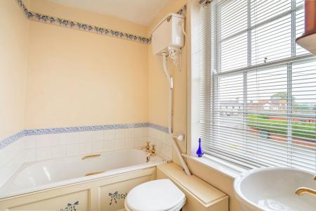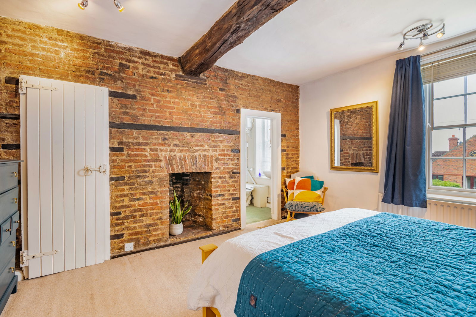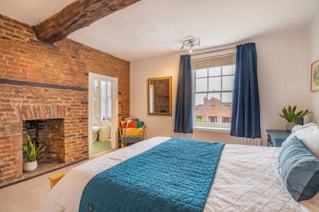 On the first floor, exposed wall and ceiling timbers add character, window reveals a pleasant view over the rear garden. There are two good sized double bedrooms, the principal benefits from an ensuite bathroom and built-in recessed shelved cupboard together with exposed brick wall, feature fireplace, large ceiling timbers and a front facing window. Bedroom two is served by a generous house bathroom and a home office area is also located on this floor, with a return staircase leading to the second floor.