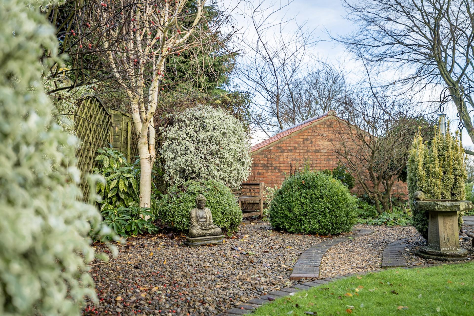 Outside, the home has attractive kerb appeal with a dwarf wall, wrought-iron railings, and a smart courtyard-style front garden. To the rear, a long gravelled driveway leads to the detached double garage, complete with power and lighting. The garden is full of charm, featuring a summer house, greenhouse, and a Japanese-inspired area. The raised rear garden has been landscaped for low maintenance, with a neat lawn and well-planned borders. A gated side passage provides convenient access to the oil tank, coal bunkers, and additional storage.