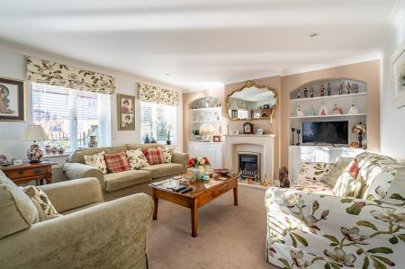 Positioned side-on for added privacy, the property opens into a spacious and inviting hallway. From here, double doors open into the generous lounge, a bright and comfortable space with dual-aspect windows filling the room with natural light. An electric fire and bespoke alcove storage provide a focal point, enhancing the room's cosy yet airy ambiance.