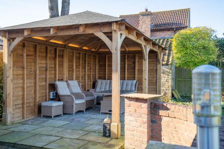 Inside, the welcoming entrance hall leads to a bright sitting room featuring a log-burning stove and delightful views of fields to the front. A standout feature is the stunning open-plan dining kitchen, complete with a Rangemaster cooker, granite worktops, and underfloor heating. This space seamlessly extends onto a generous rear garden-an ideal setting for hosting and entertaining, enhanced by a built-in bar, a recently added covered pergola, and multiple seating areas.