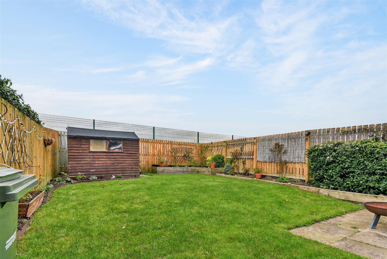 A stone pathway leads through a timber gate into the enclosed rear garden, laid mainly to lawn with a shaped patio immediately beyond the dining area. Mature planted borders framed by timber sleepers add structure and seasonal interest, with a timber shed positioned at the rear boundary. External features include an outside tap, external power point and lighting.