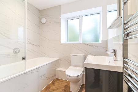 To the first floor, there are 2 double bedrooms and a family bathroom which has been fitted with stylish marble tiles. Stairs rise again to the first floor, where there is an additional double bedroom with W/C and large storage cupboard.