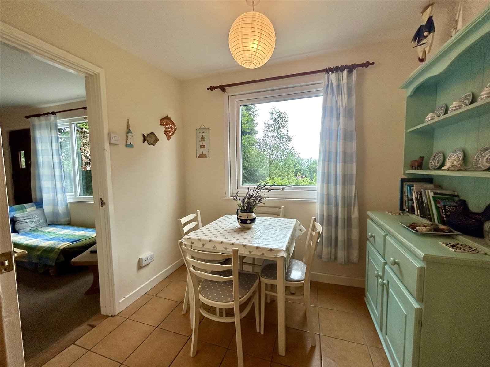 'The chalet comprises of a spacious living room, with large window to the front of the property, with views towards the adjoining woodland below. The living room benefits from dual aspect windows providing an abundance of natural light. The kitchen breakfast room is located off of the living space. The kitchen is well stocked with base and wall units, laminate worktops, and an inset sink with draining board. The kitchen further comprises of integrated appliances including electric oven, ceramic hob, and fridge freezer. Ample space is provided for a breakfast dining table, taking in the rural setting adjoining the chalet.