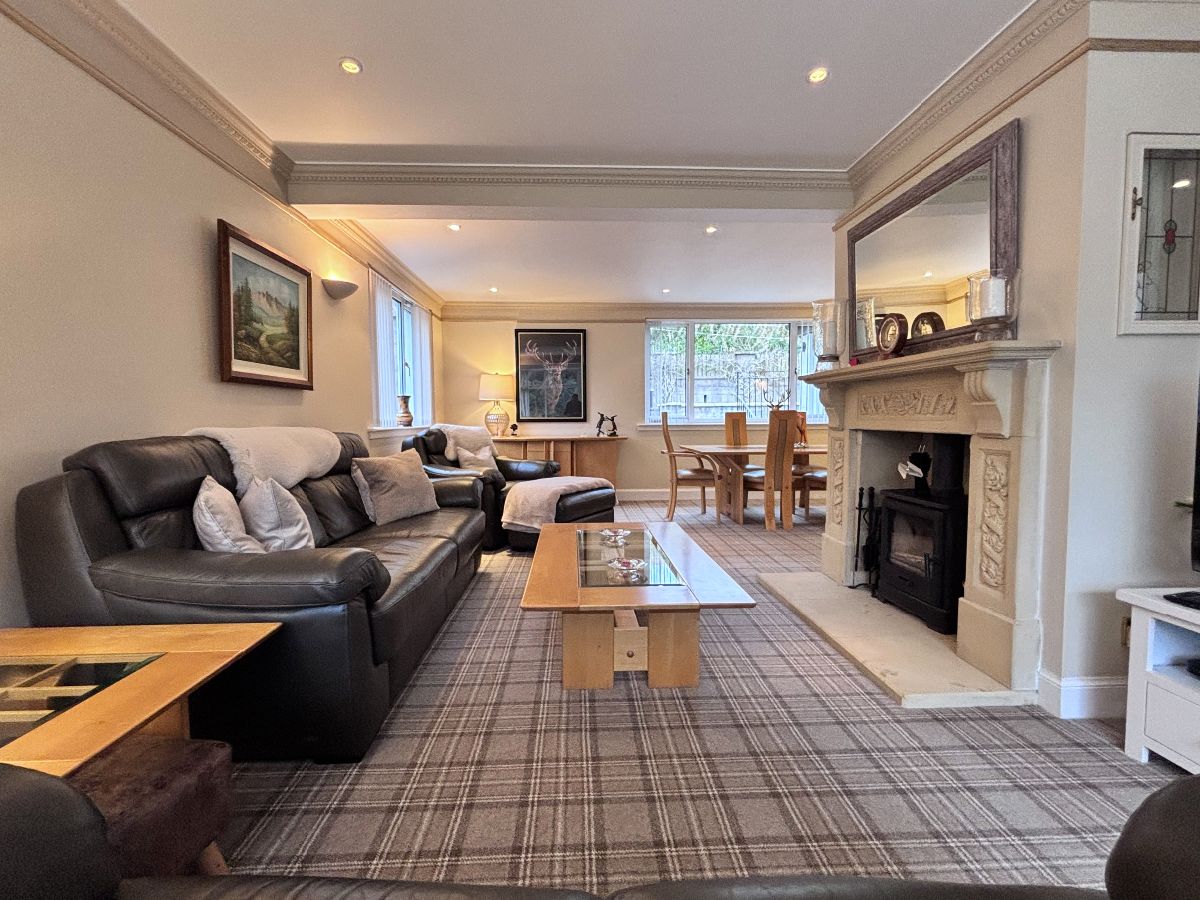 The heart of the home is the open-plan lounge and dining area, where a striking square bay window frames stunning views over Loch Tay. A wood-burning stove sits at the centre, creating a warm, inviting atmosphere - perfect for relaxing evenings or entertaining guests.