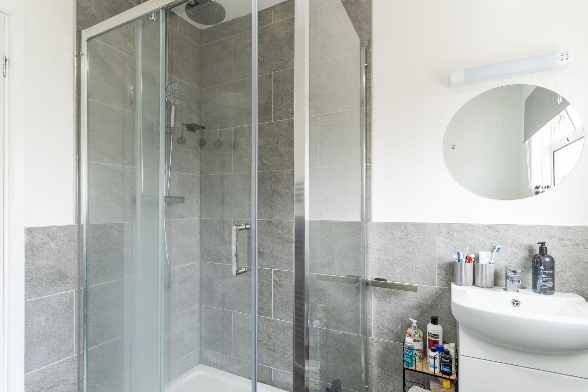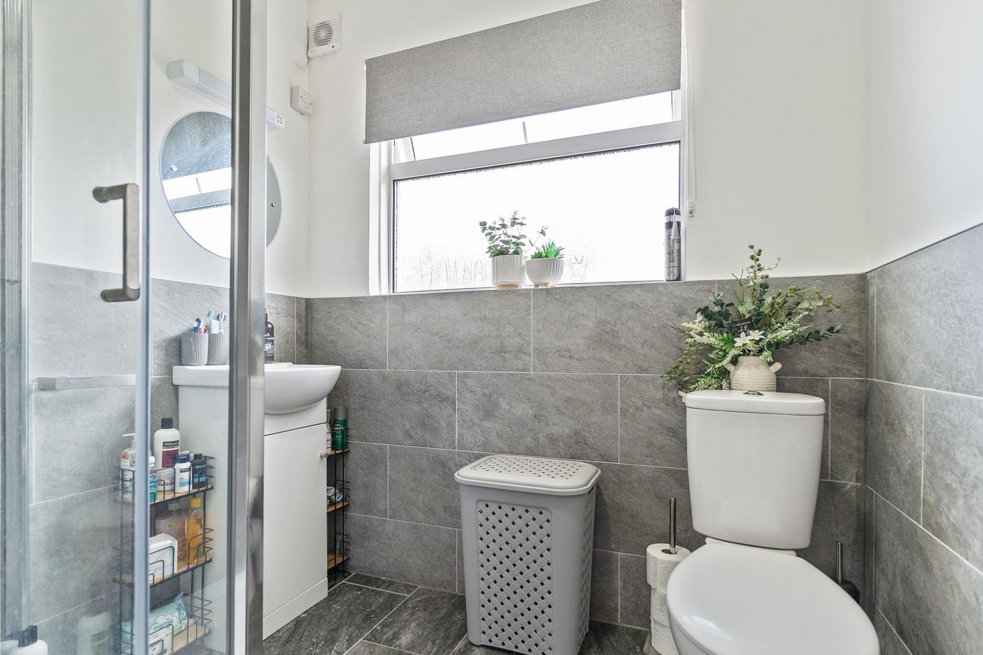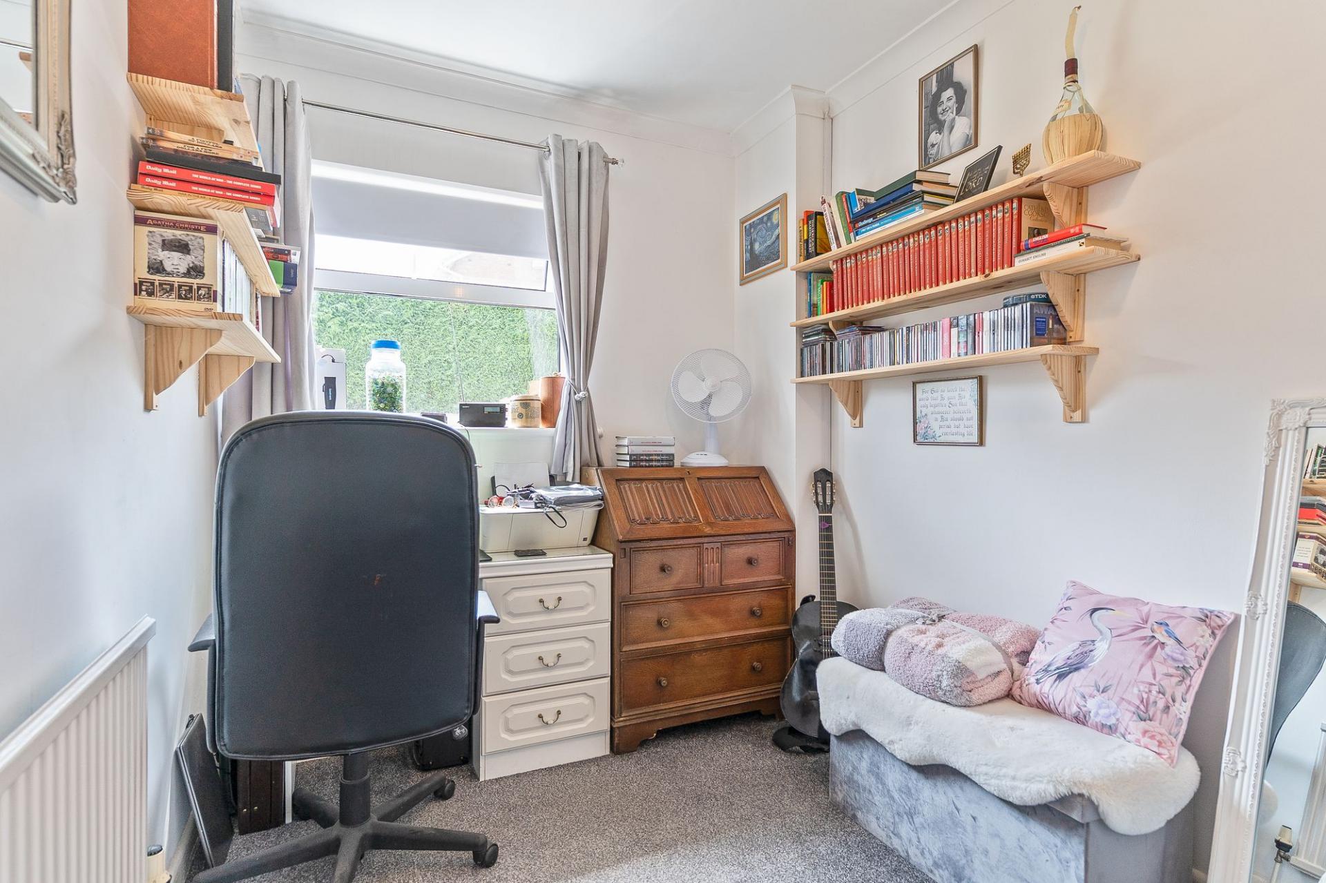 All three bedrooms are located on the ground floor, providing convenient single-level living. There are two generously sized double bedrooms, both offering pleasant outlooks and ample room for furnishings. The third bedroom is currently utilised as a home office, cleverly incorporating a built-in pull-down bed, making it a flexible space for guests. Completing the interior is a stylish and modern shower room, fitted with contemporary fixtures and a walk-in shower.