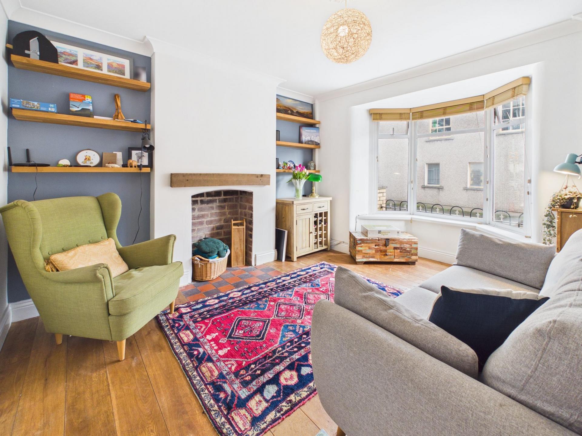 - Living room with wooden floor, fireplace and a bay window